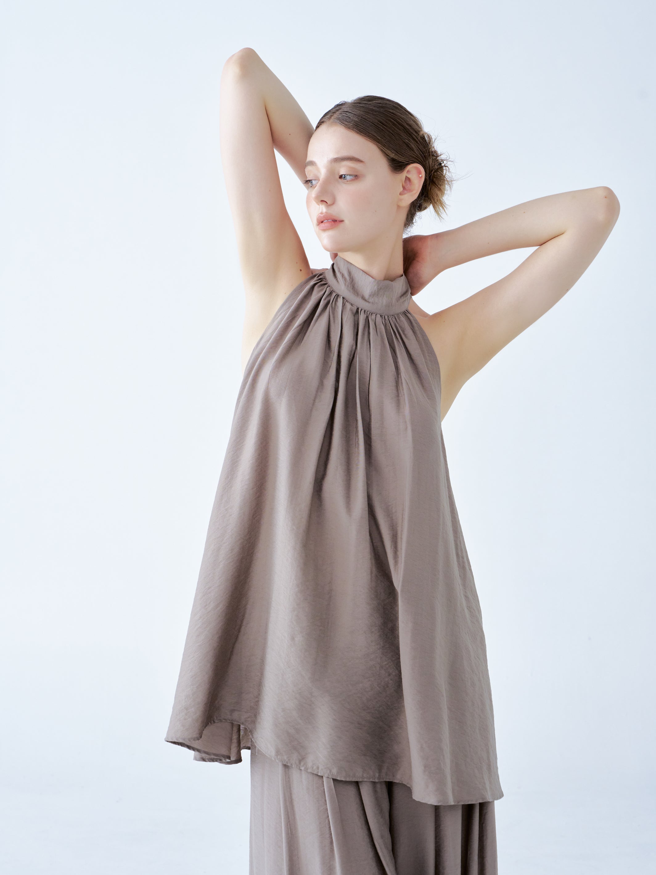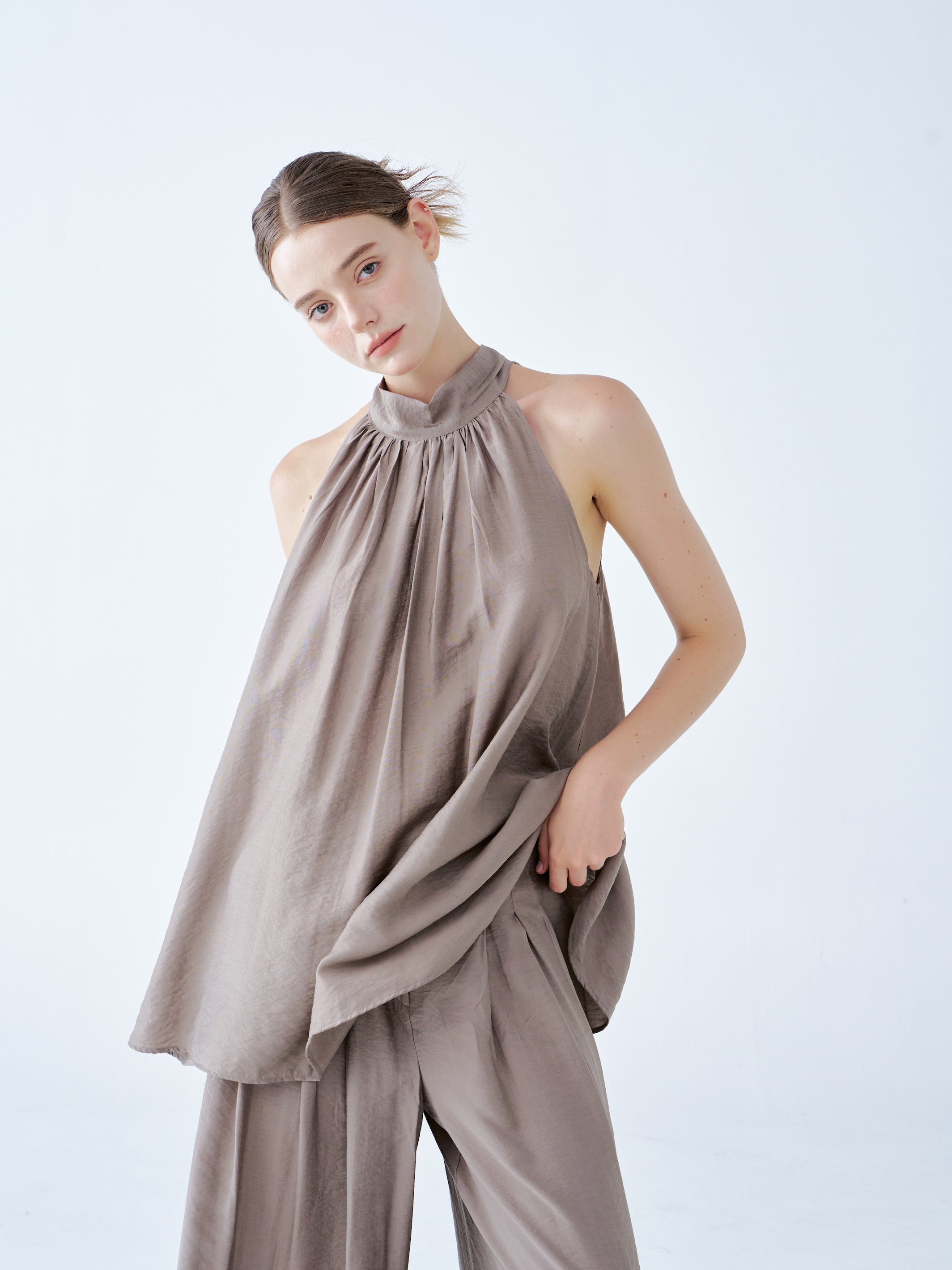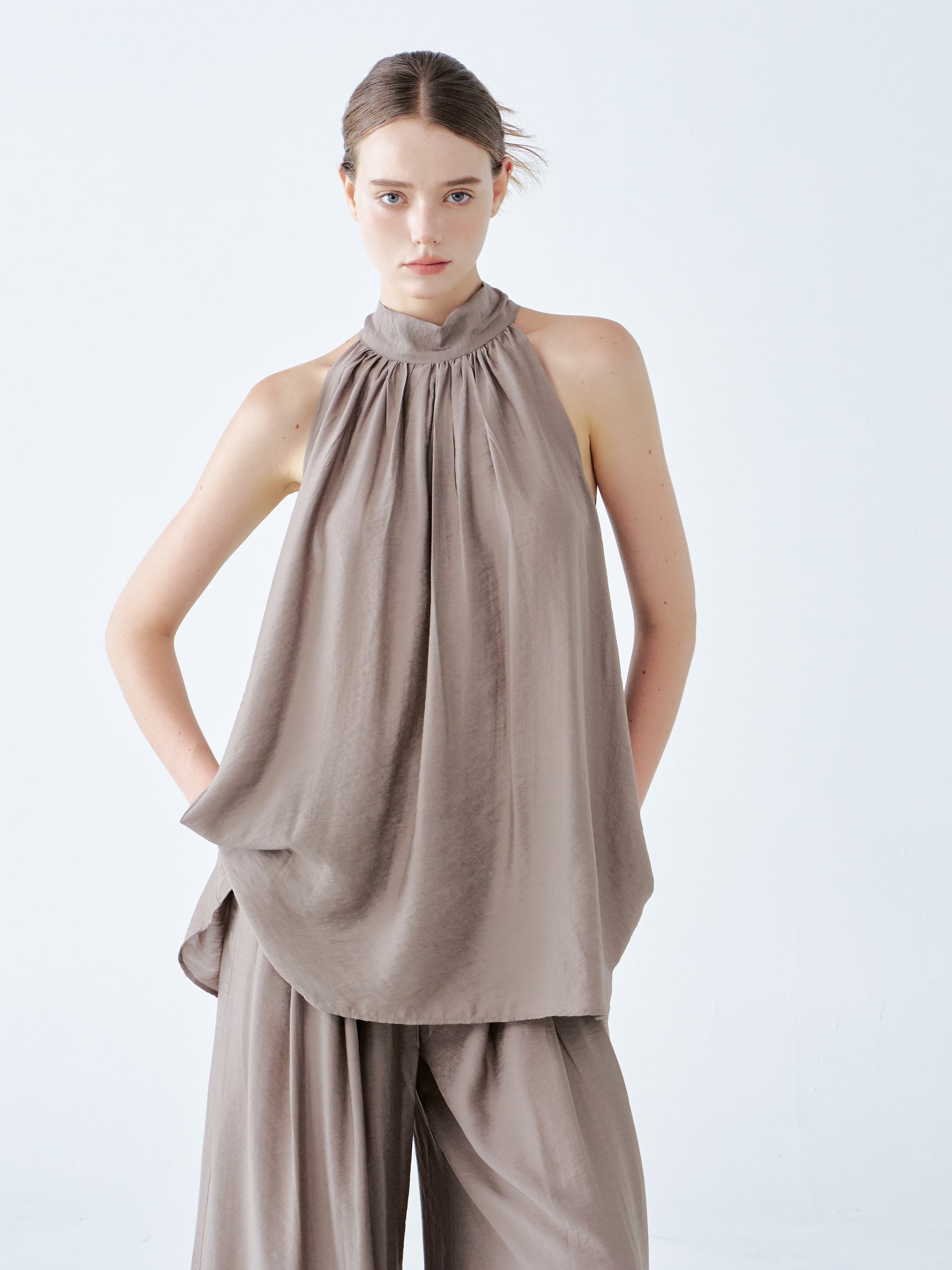The top boasts a stylish halter neckline and a loose, flowing silhouette that radiates effortless elegance. Its soft taupe fabric drapes gracefully, creating a relaxed yet refined look. This versatile piece pairs beautifully with wide-leg pants, making it ideal for both casual and sophisticated occasions.