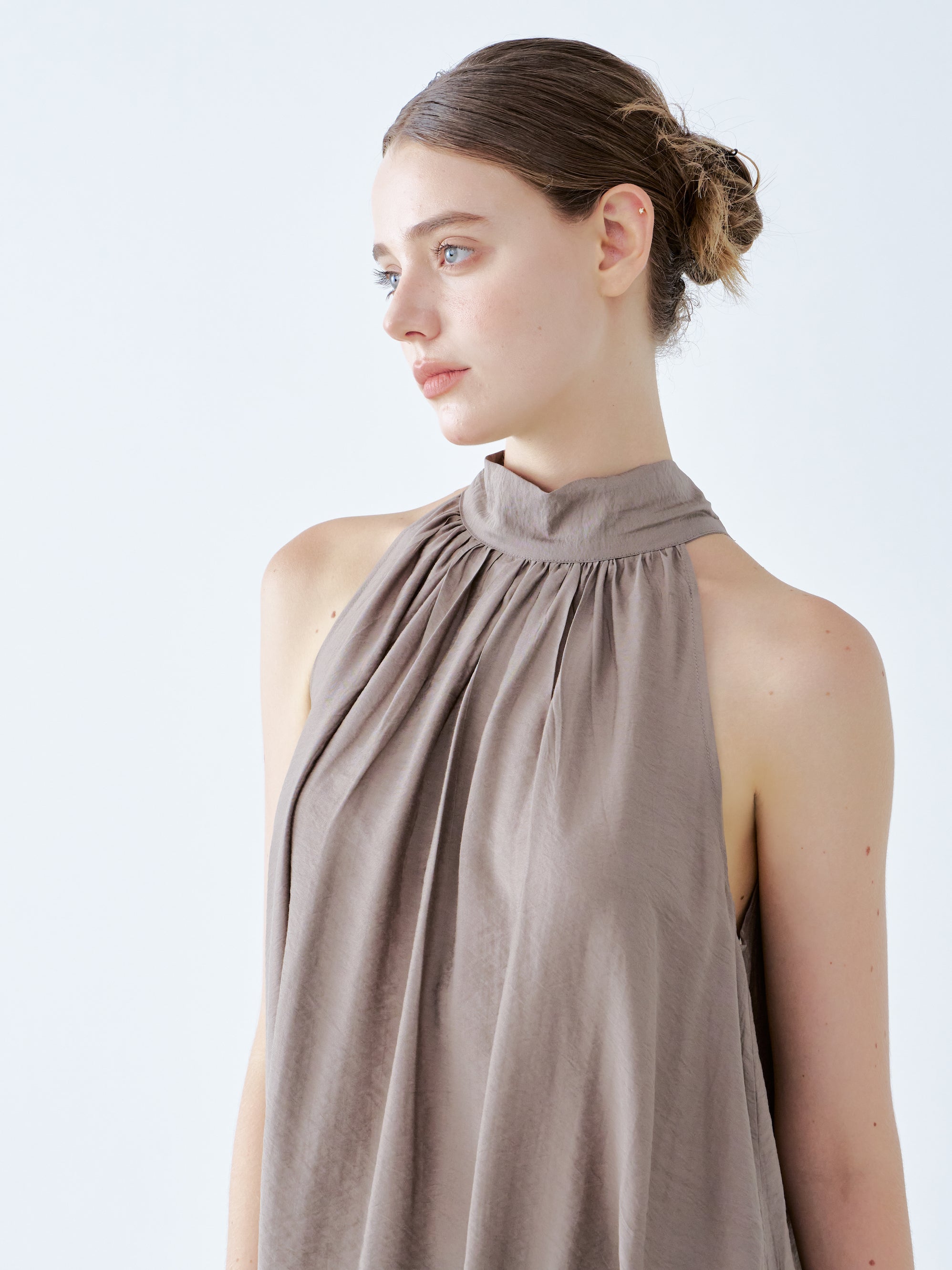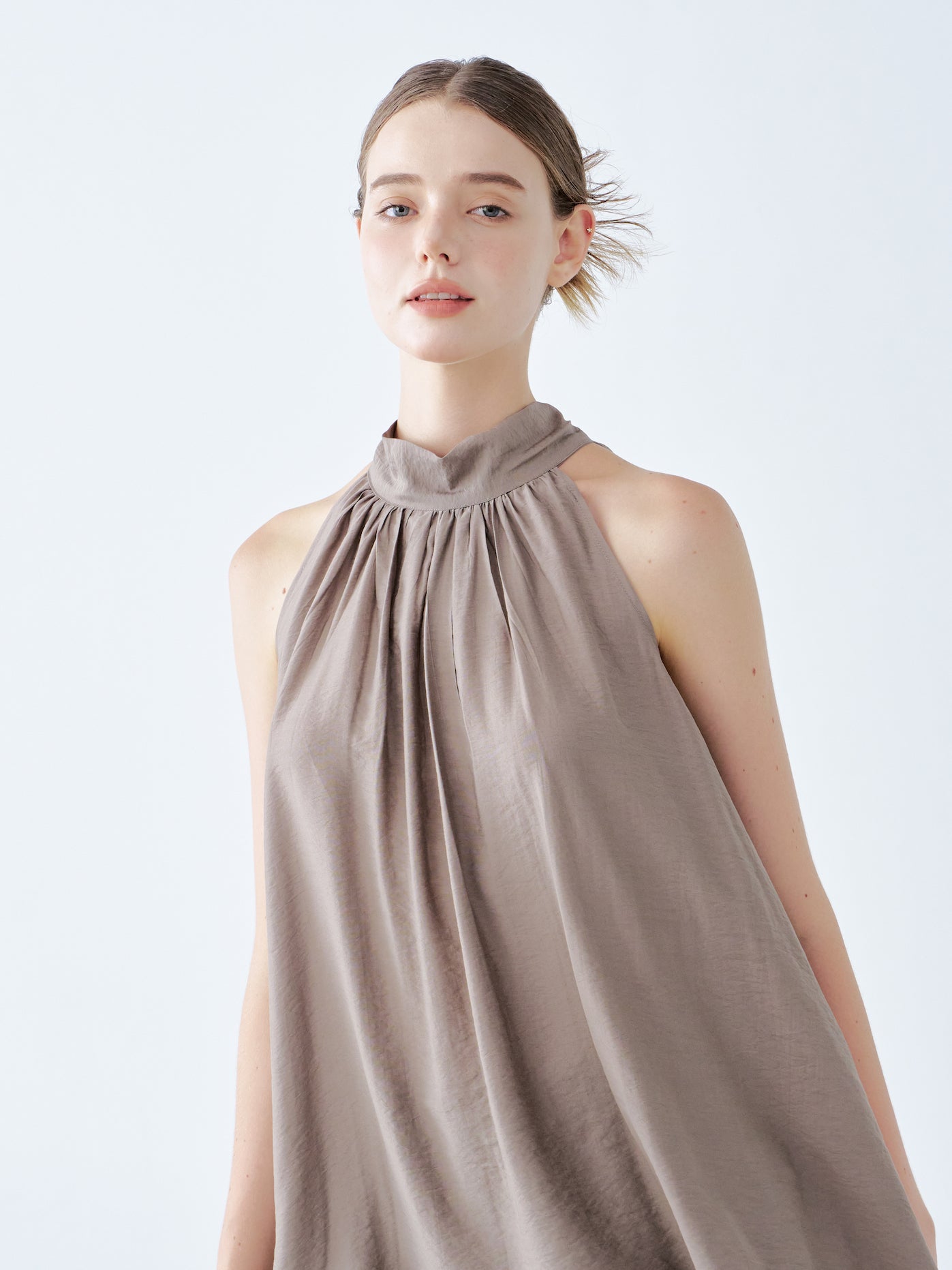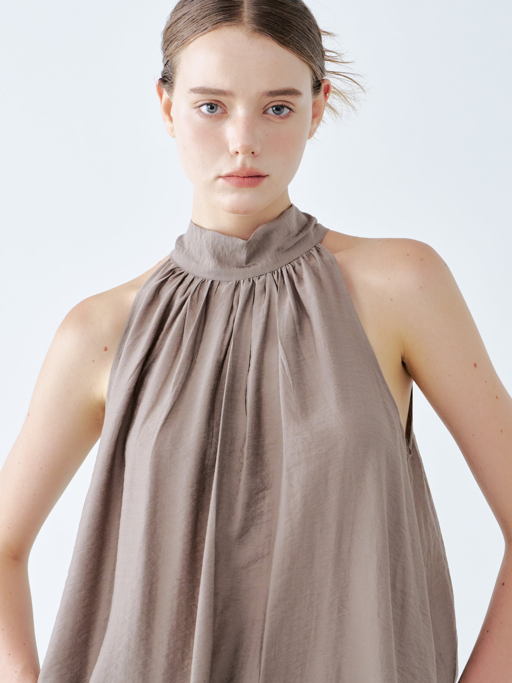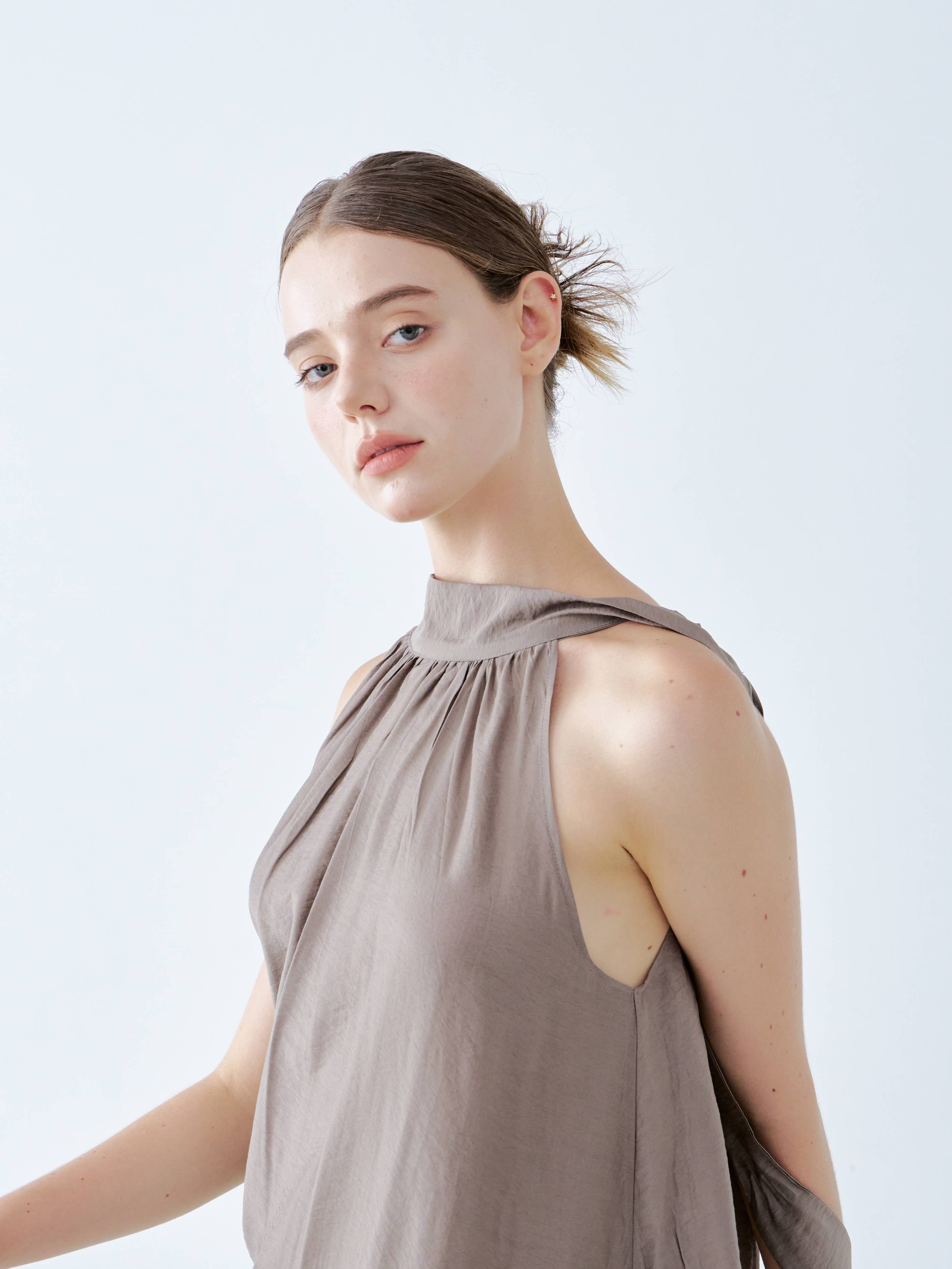 The top boasts a stylish halter neckline and a loose, flowing silhouette that radiates effortless elegance. Its soft taupe fabric drapes gracefully, creating a relaxed yet refined look. This versatile piece pairs beautifully with wide-leg pants, making it ideal for both casual and sophisticated occasions.