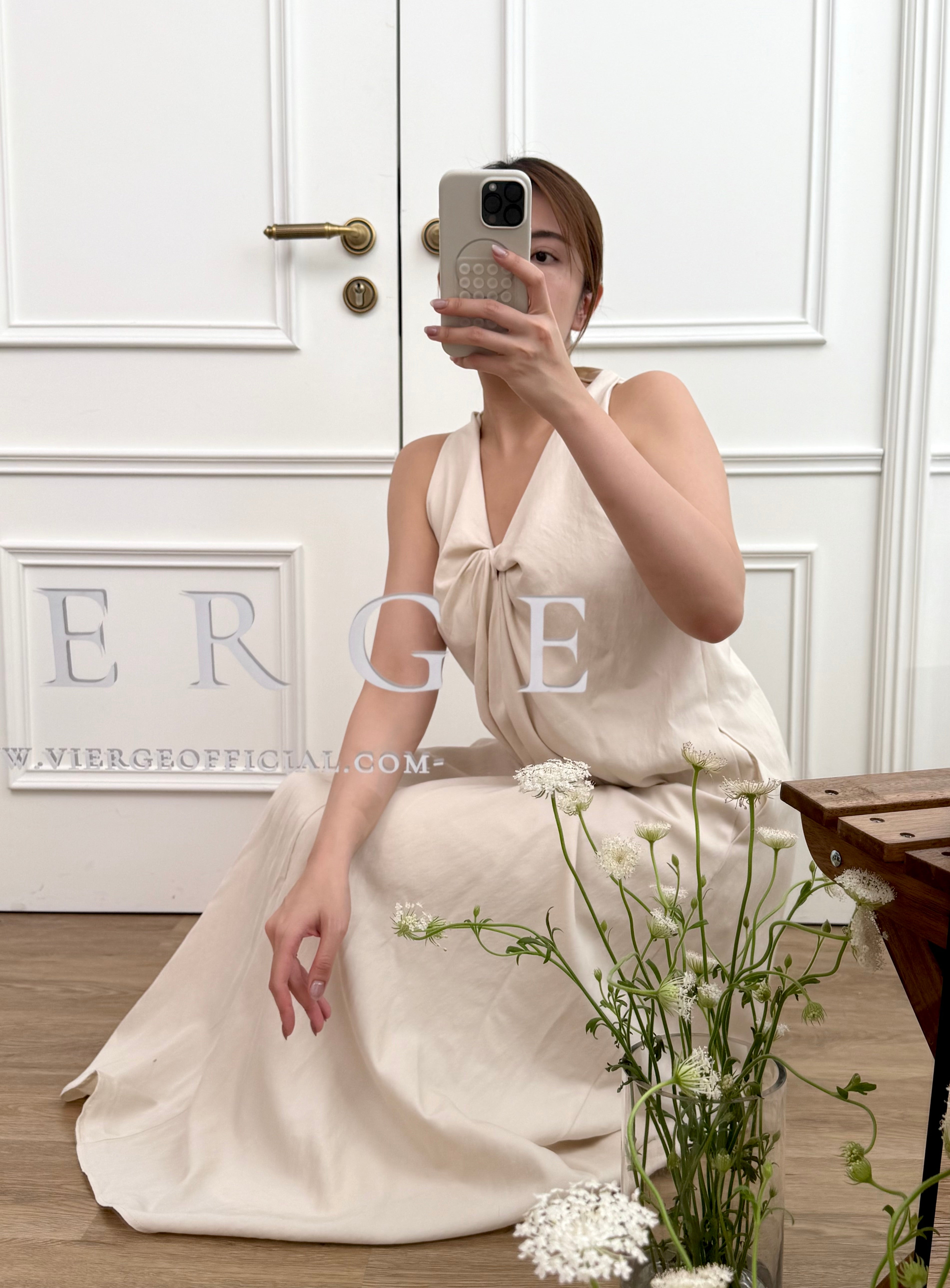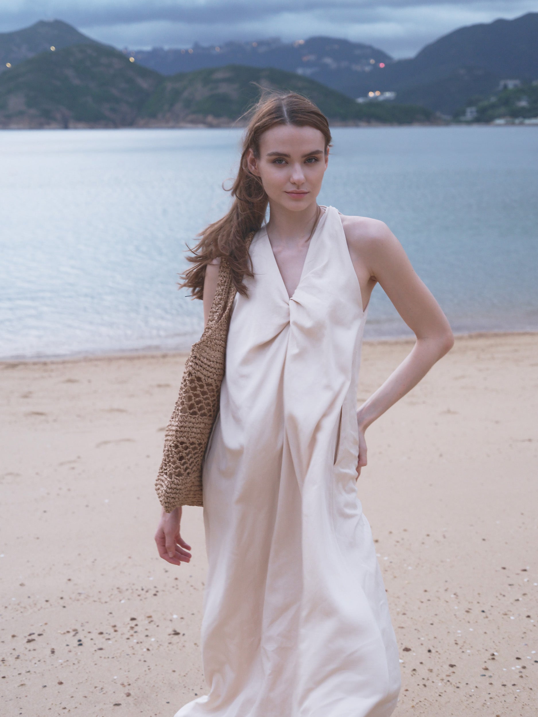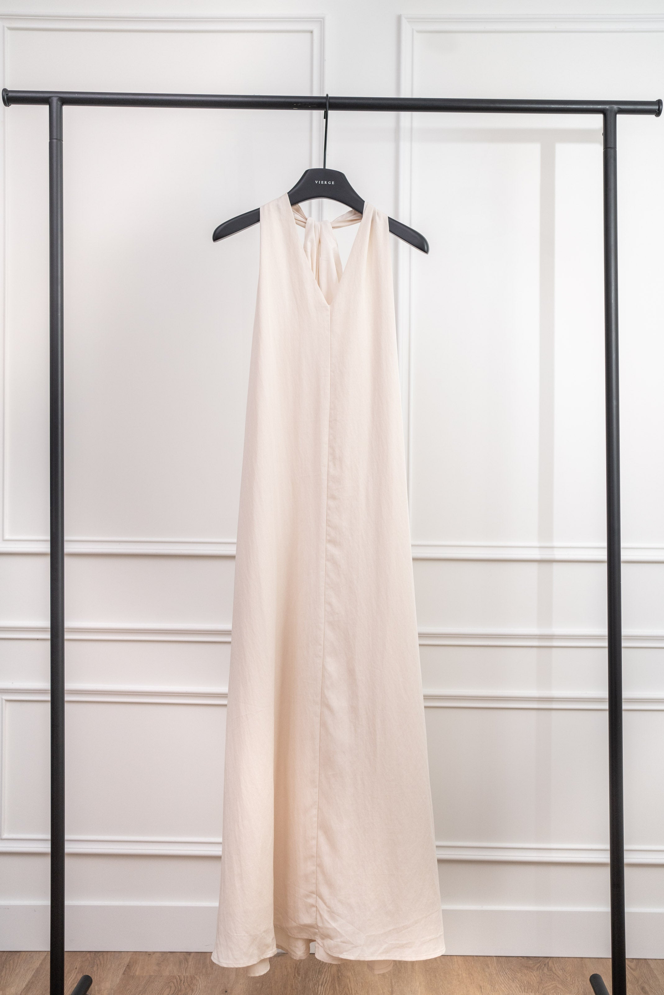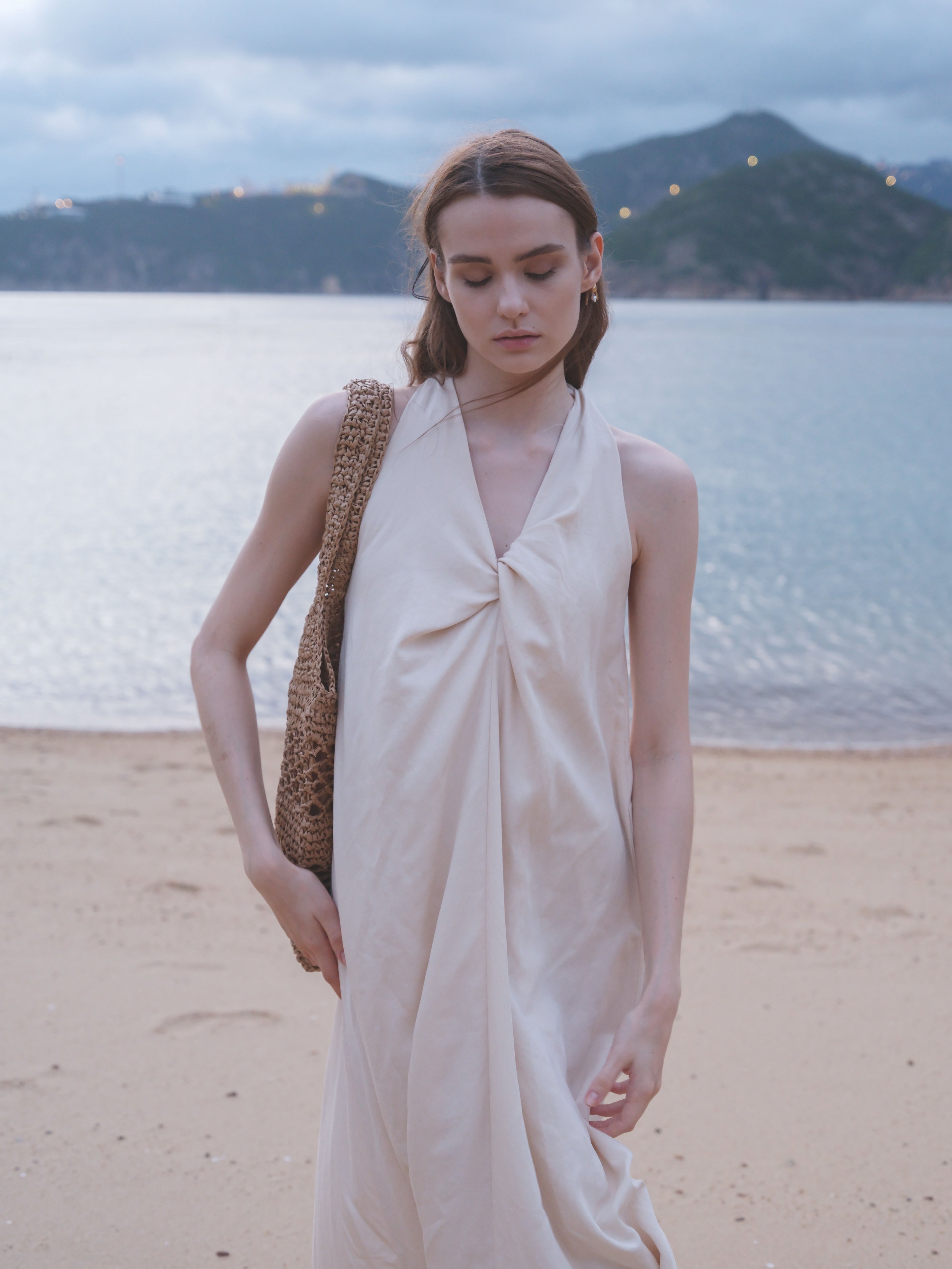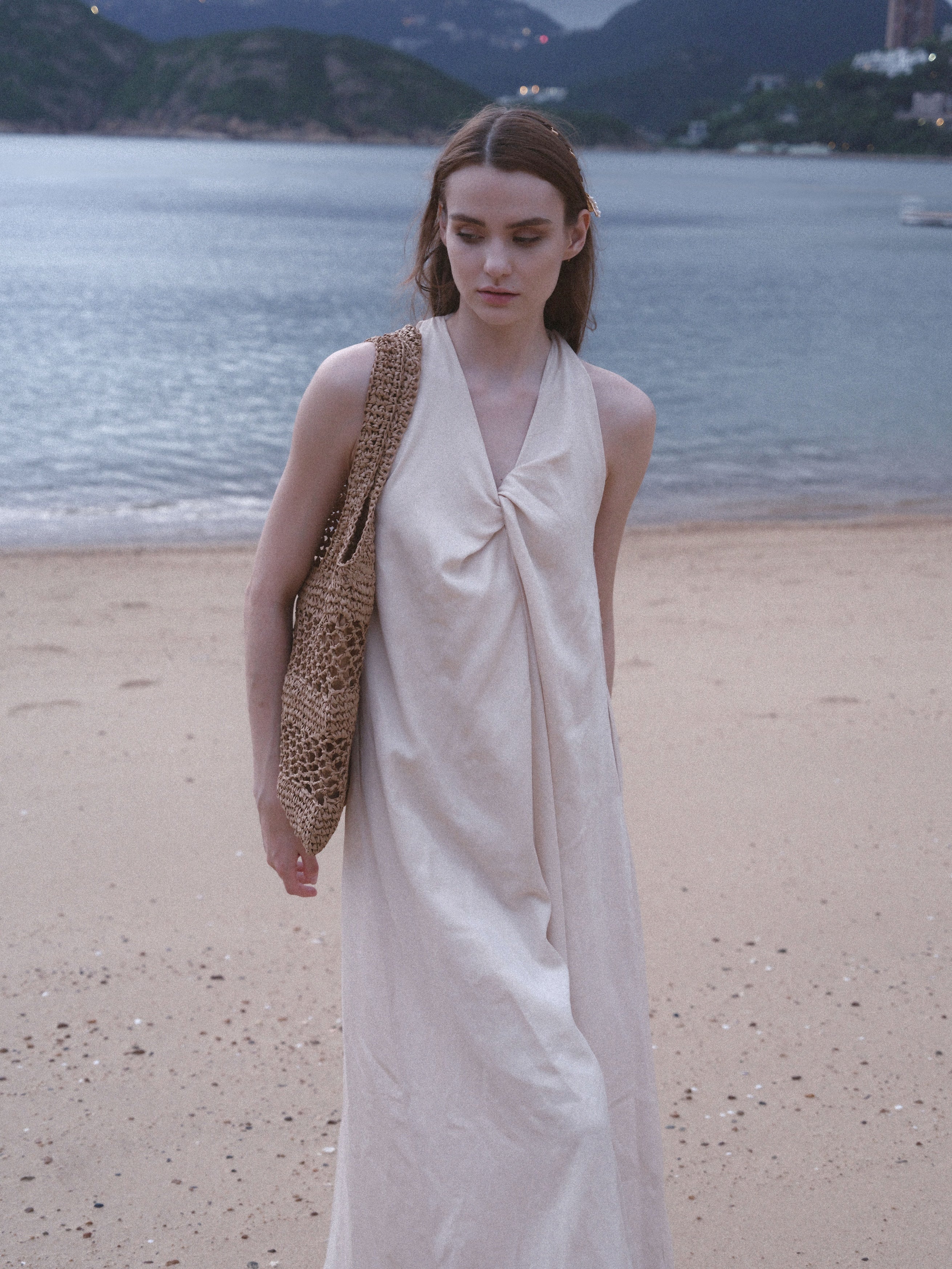 This elegant dress features a flattering halter neckline with a draped design that creates a beautiful silhouette. Its soft, neutral fabric flows gracefully, making it perfect for beach outings or summer events.