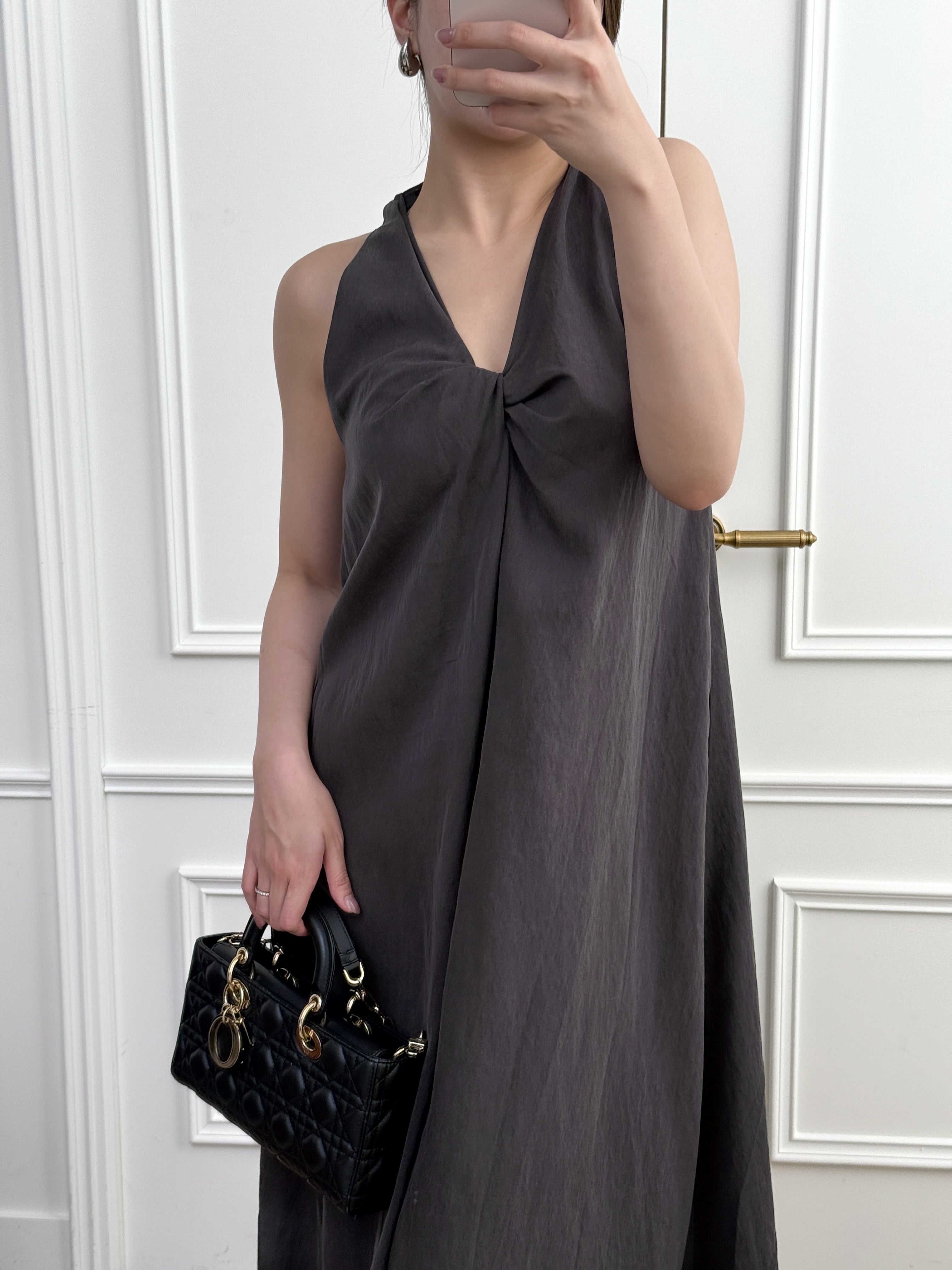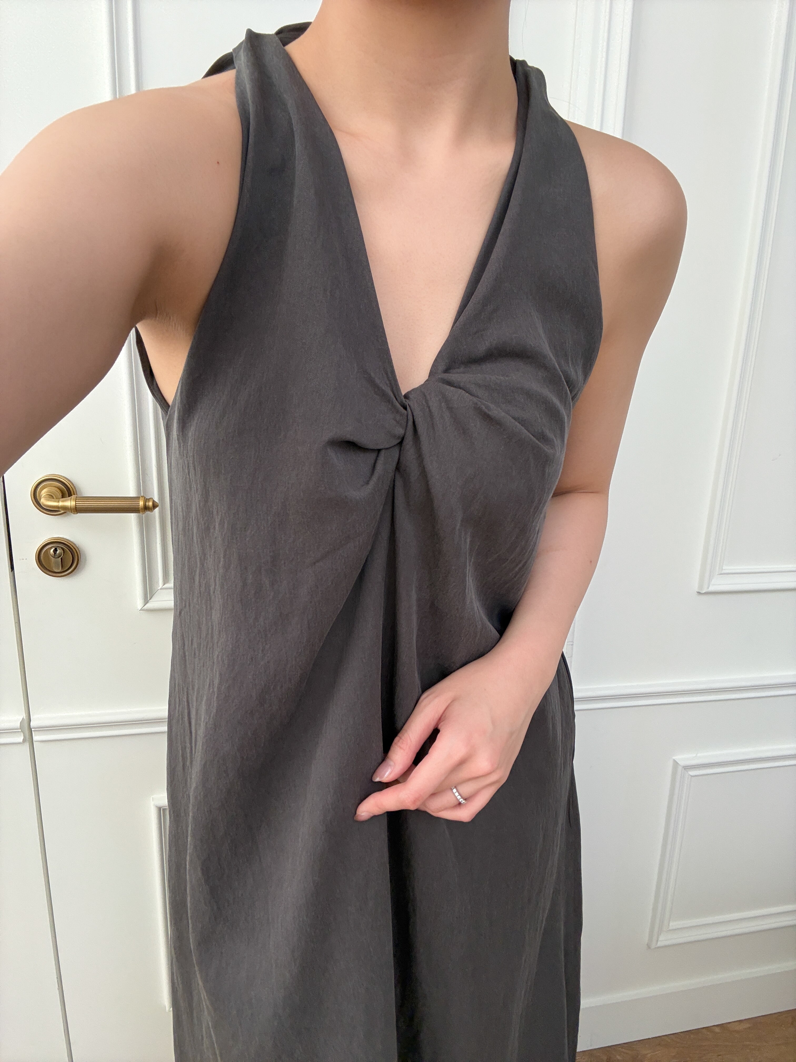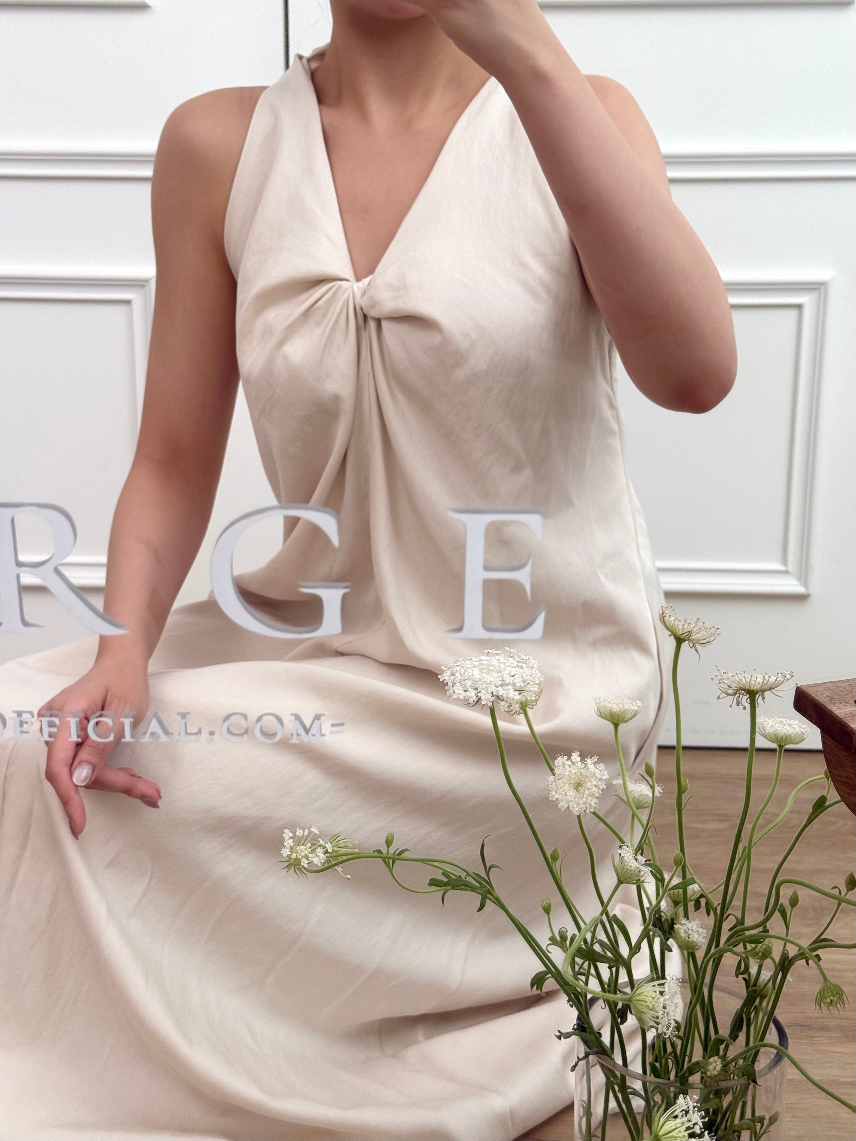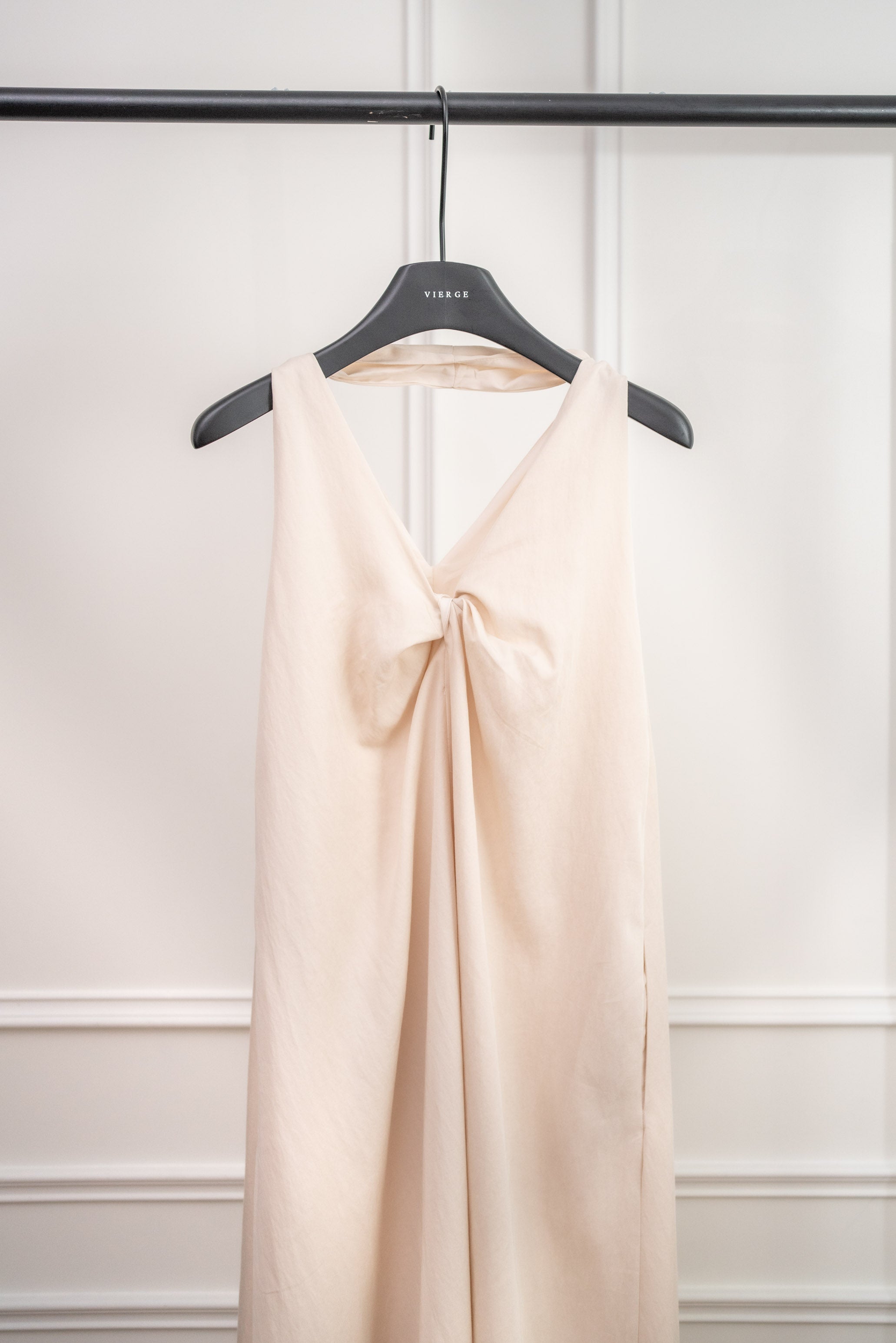 This elegant dress features a flattering halter neckline with a draped design that creates a beautiful silhouette. Its soft, neutral fabric flows gracefully, making it perfect for beach outings or summer events.