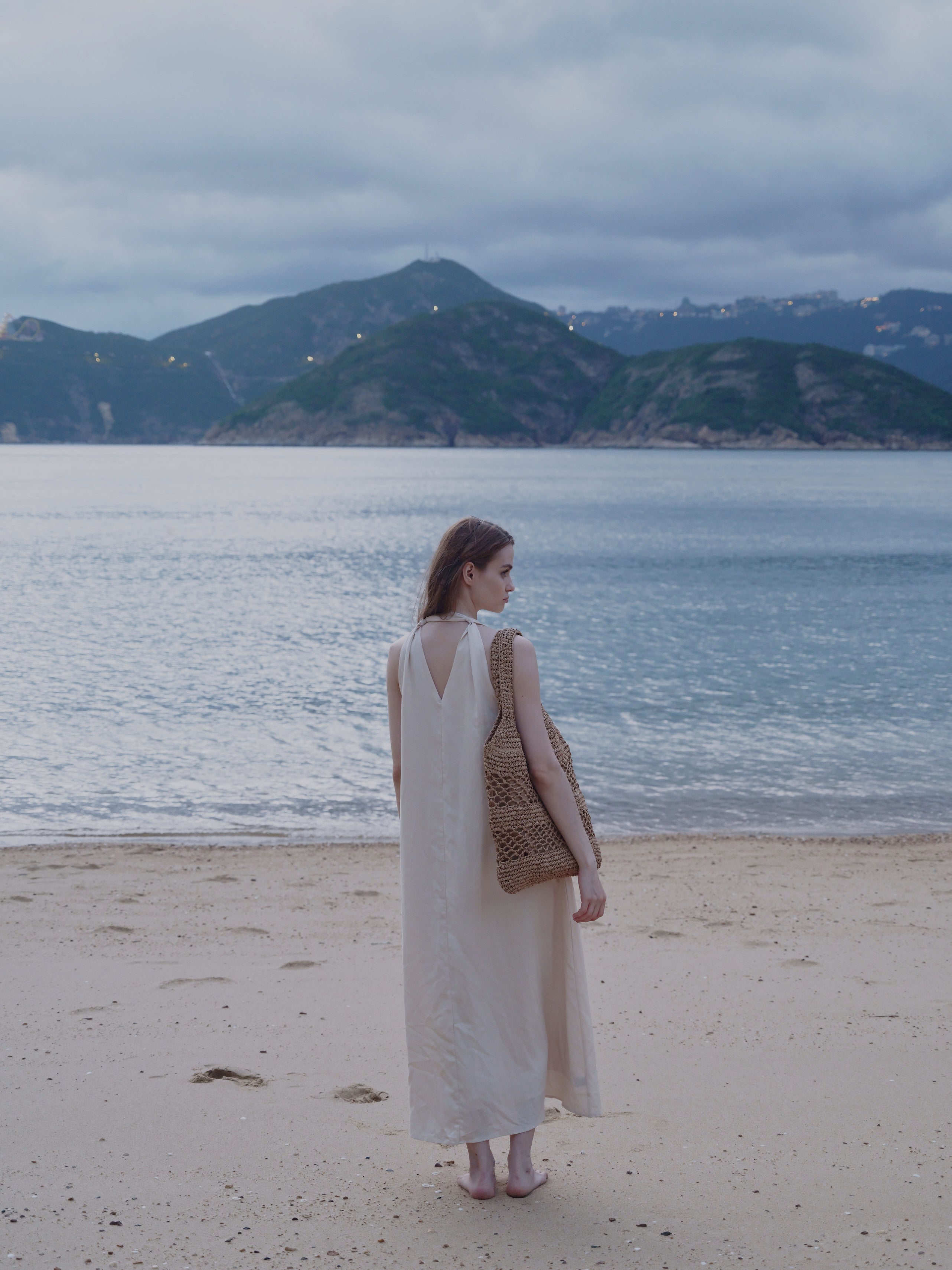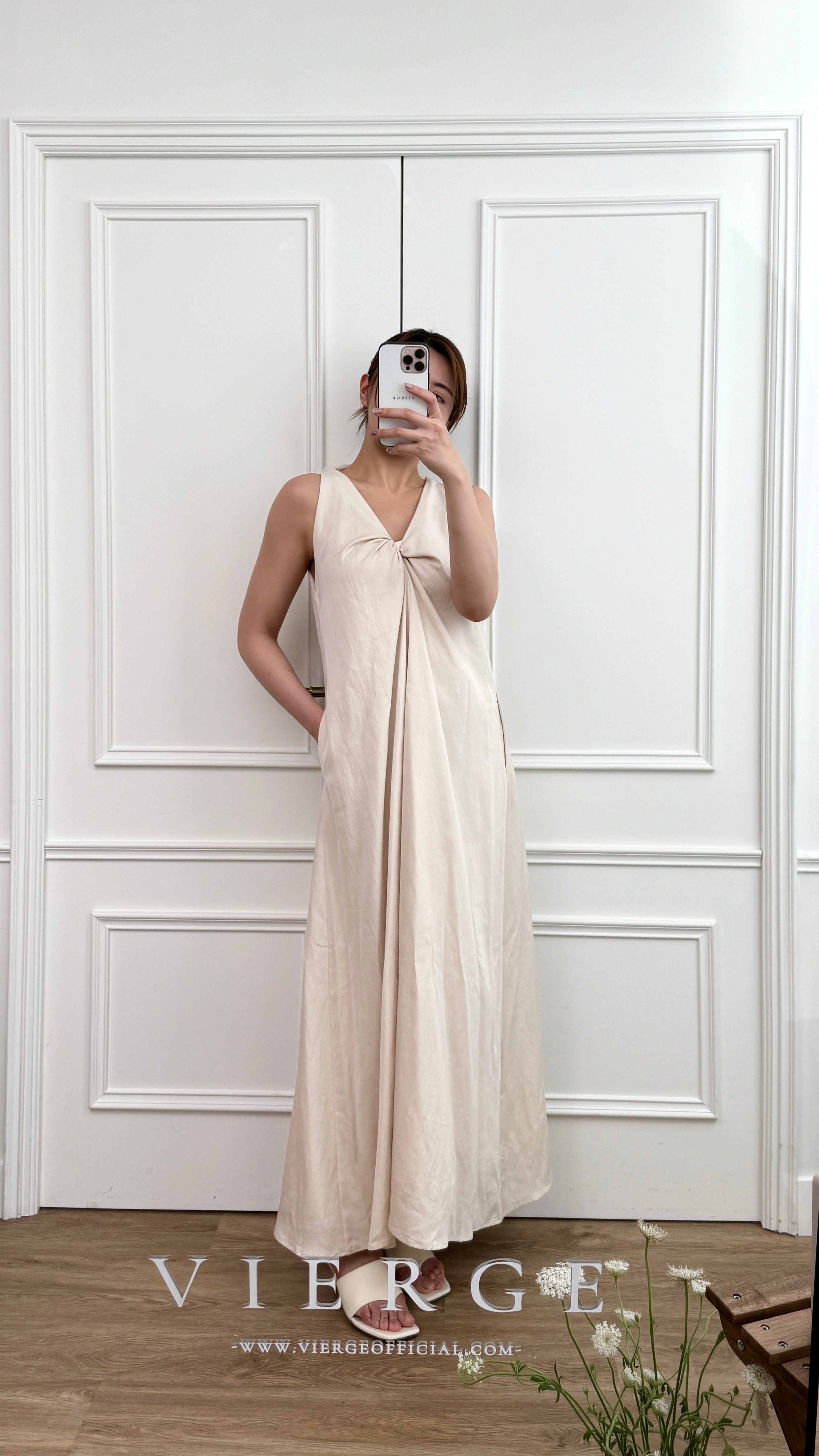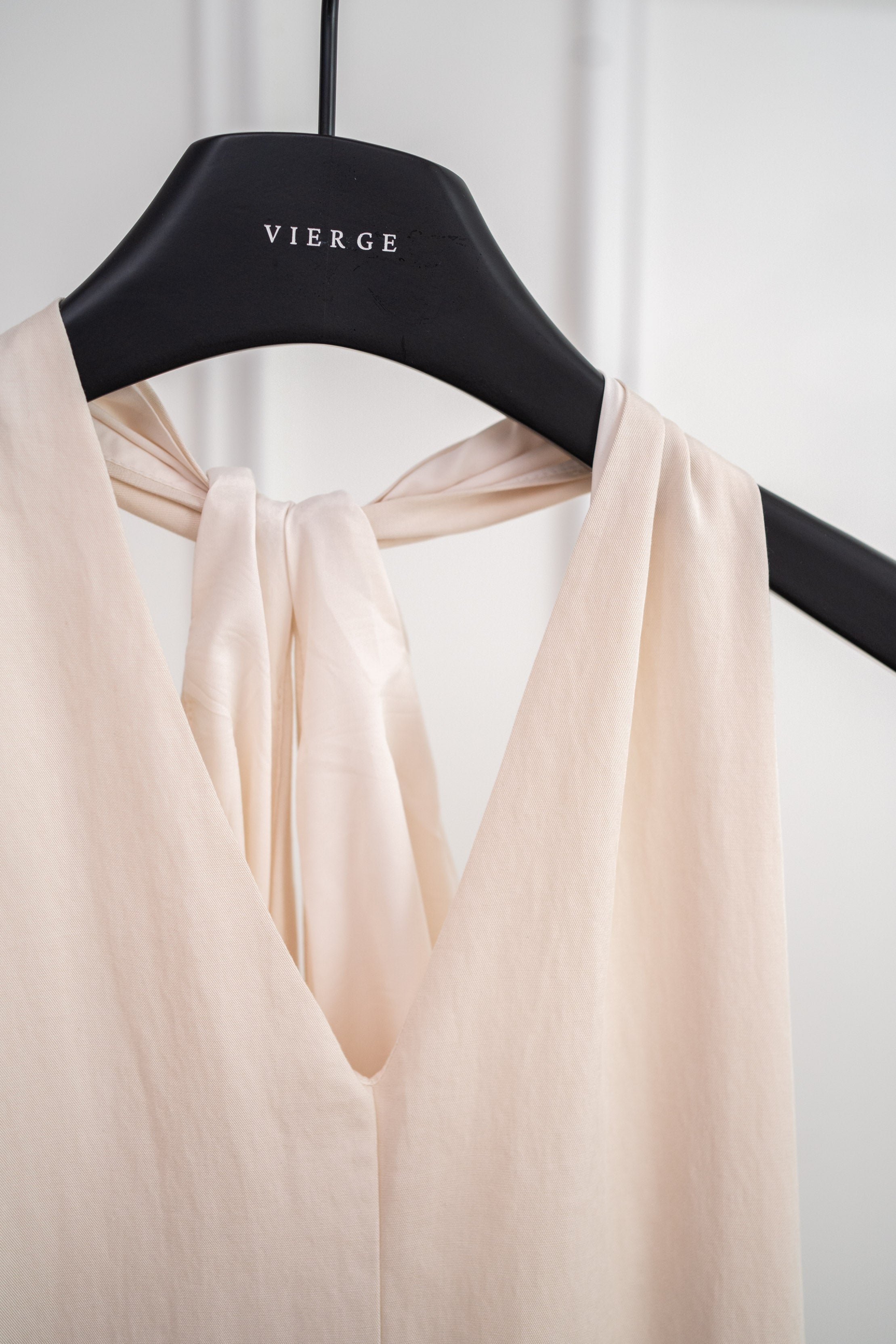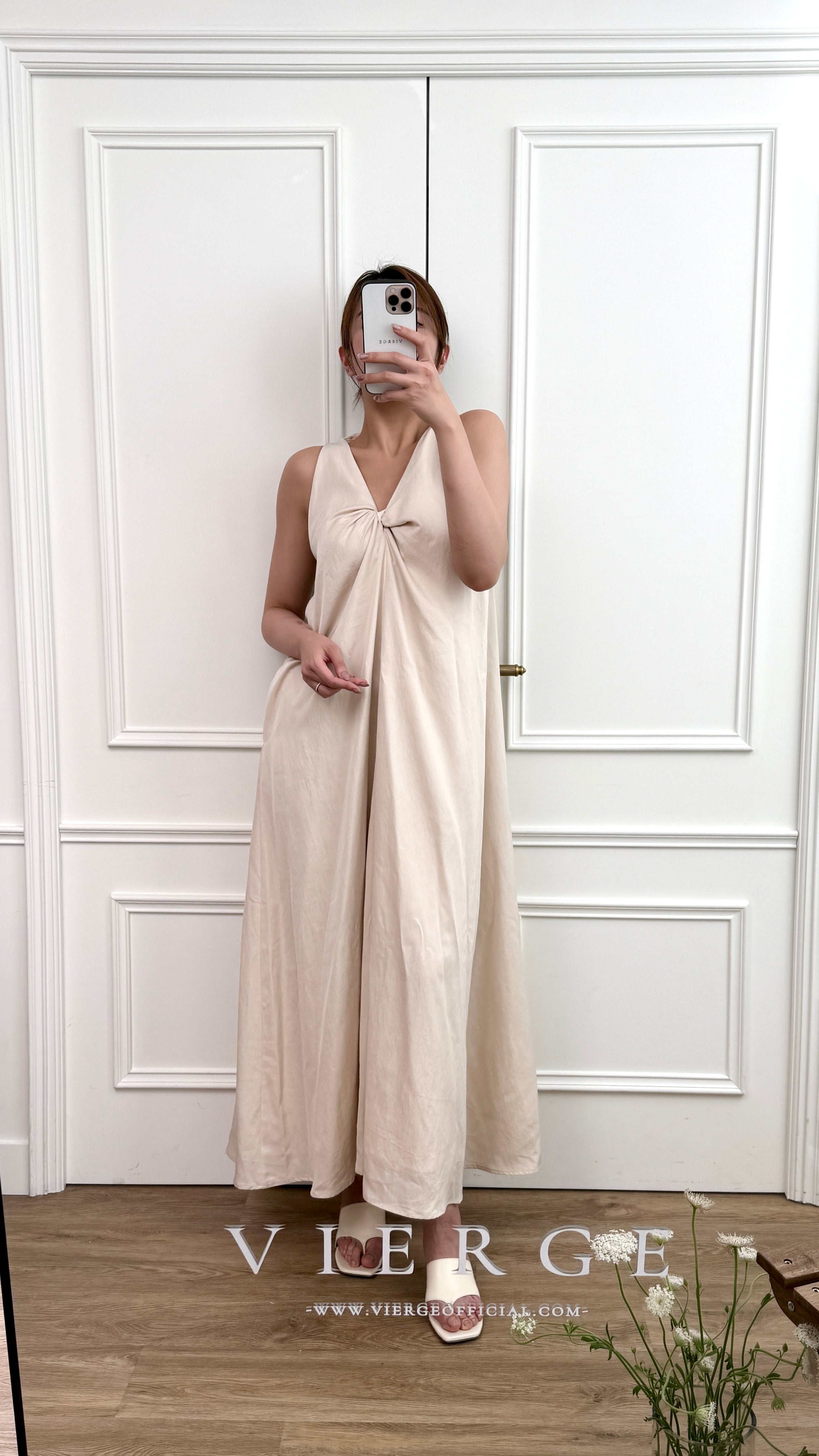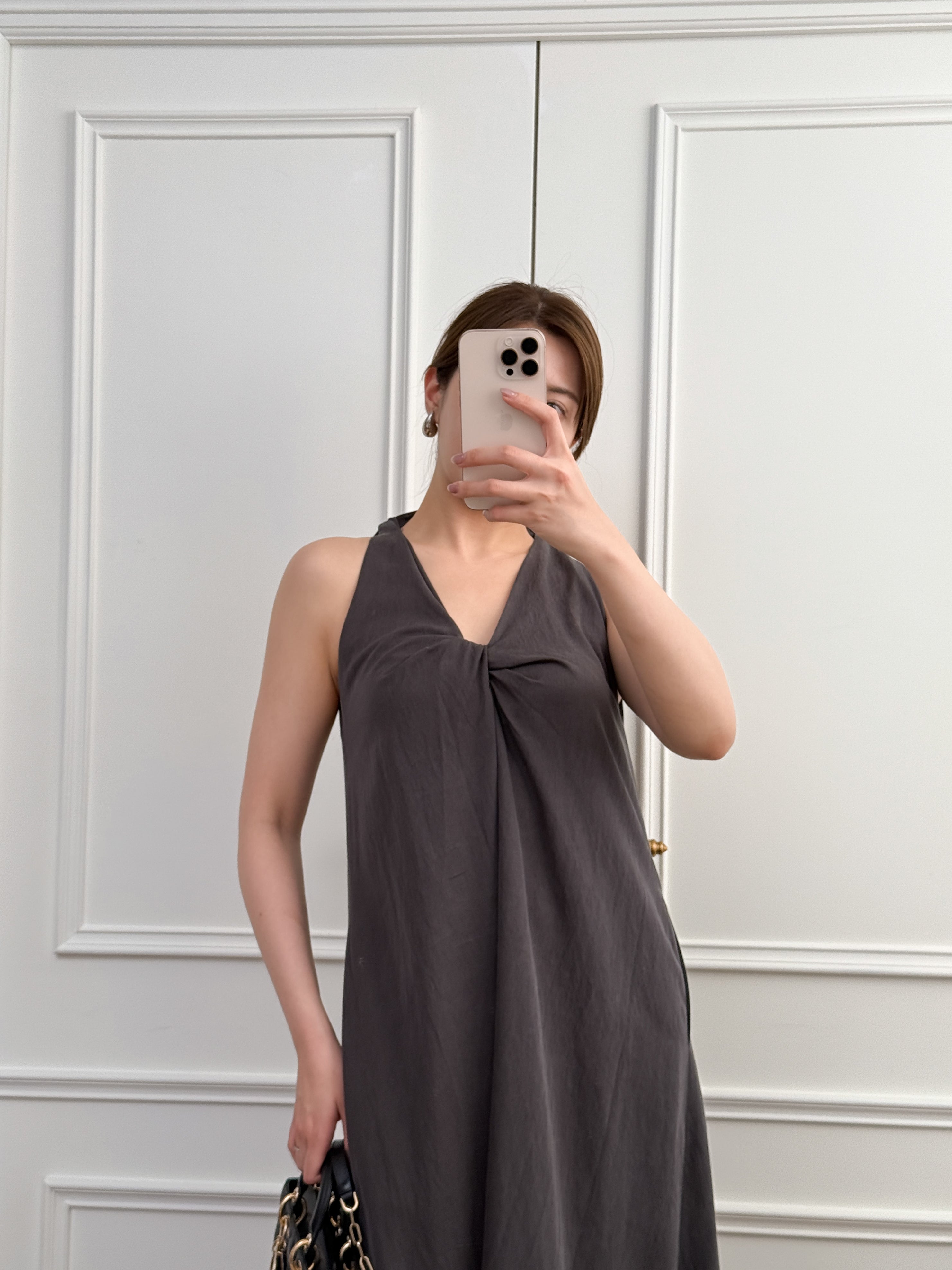 This elegant dress features a flattering halter neckline with a draped design that creates a beautiful silhouette. Its soft, neutral fabric flows gracefully, making it perfect for beach outings or summer events.