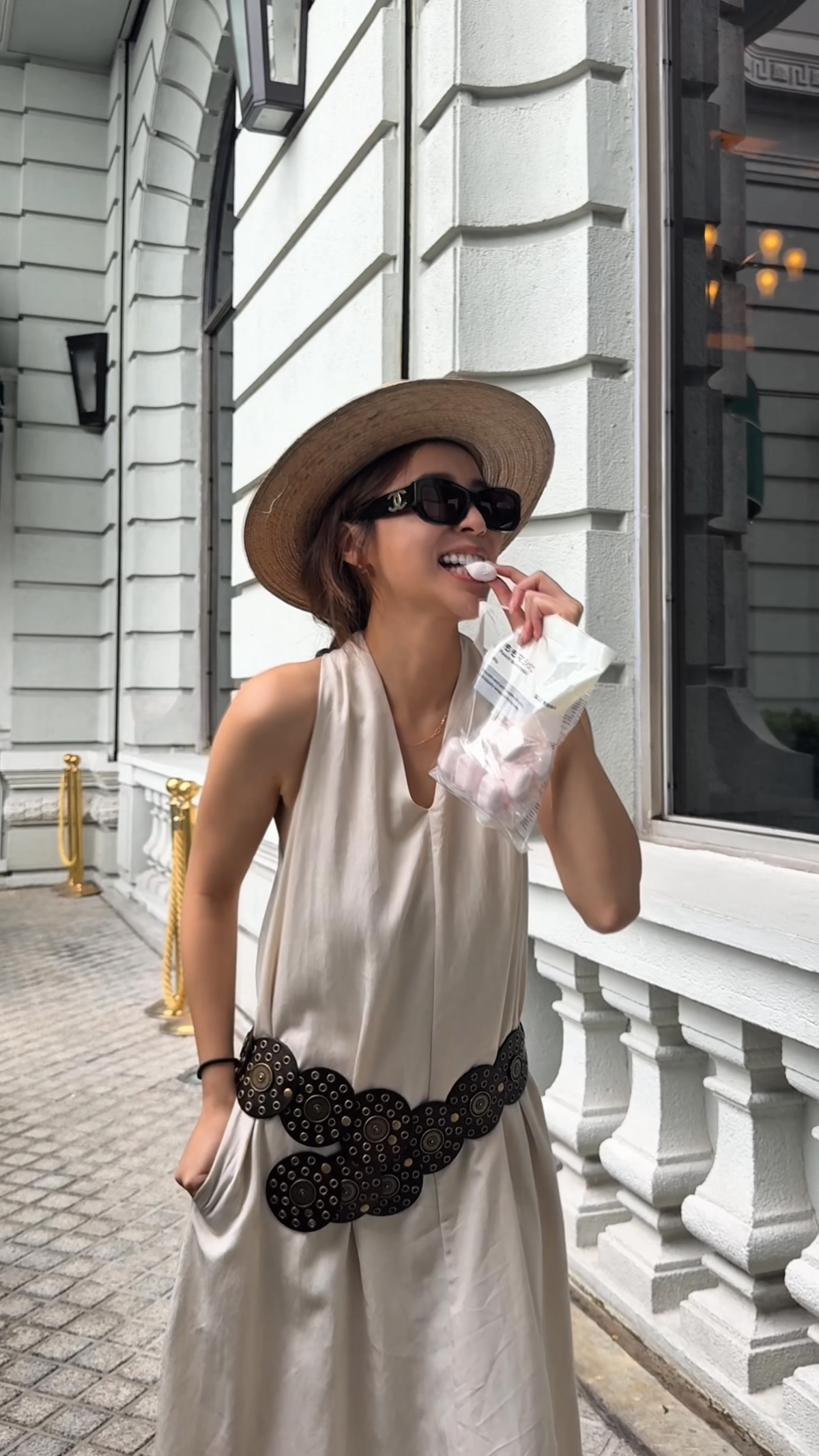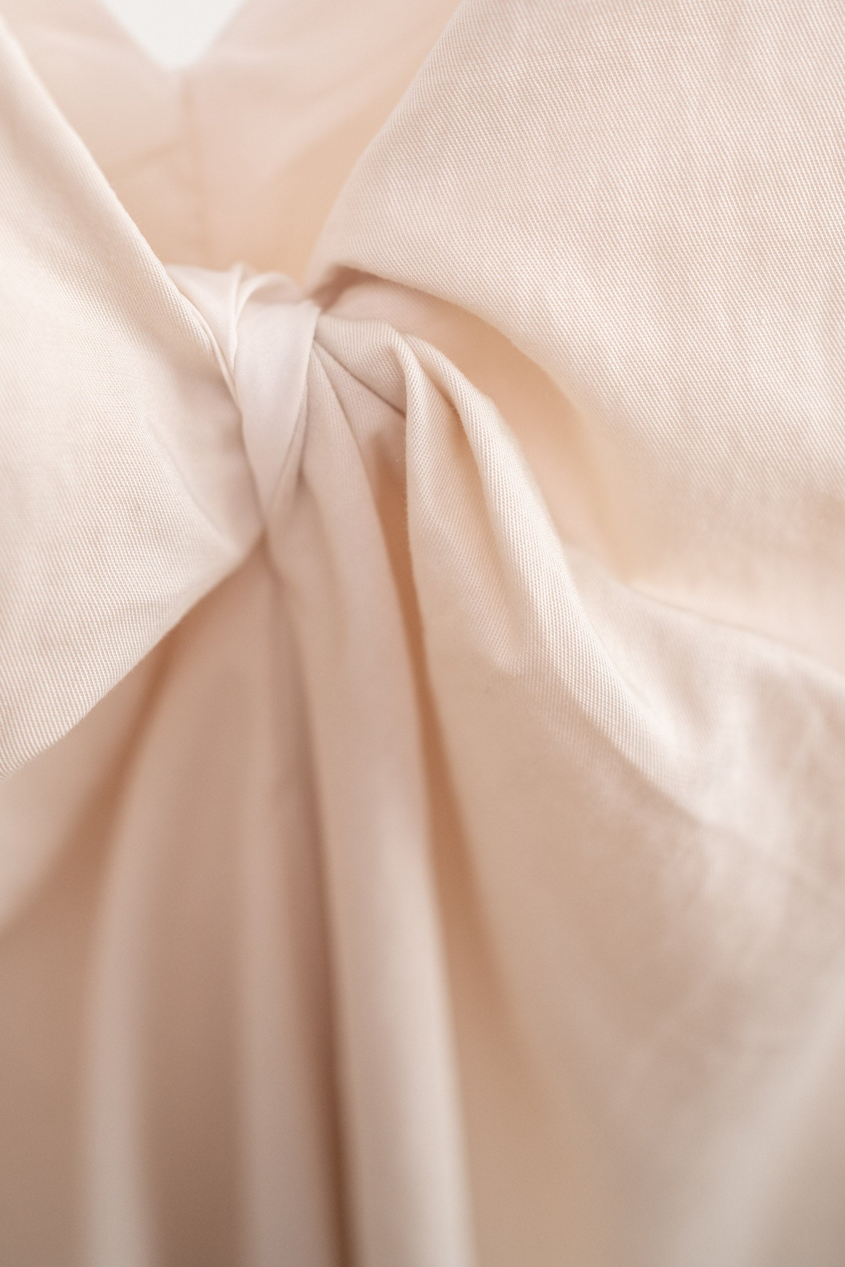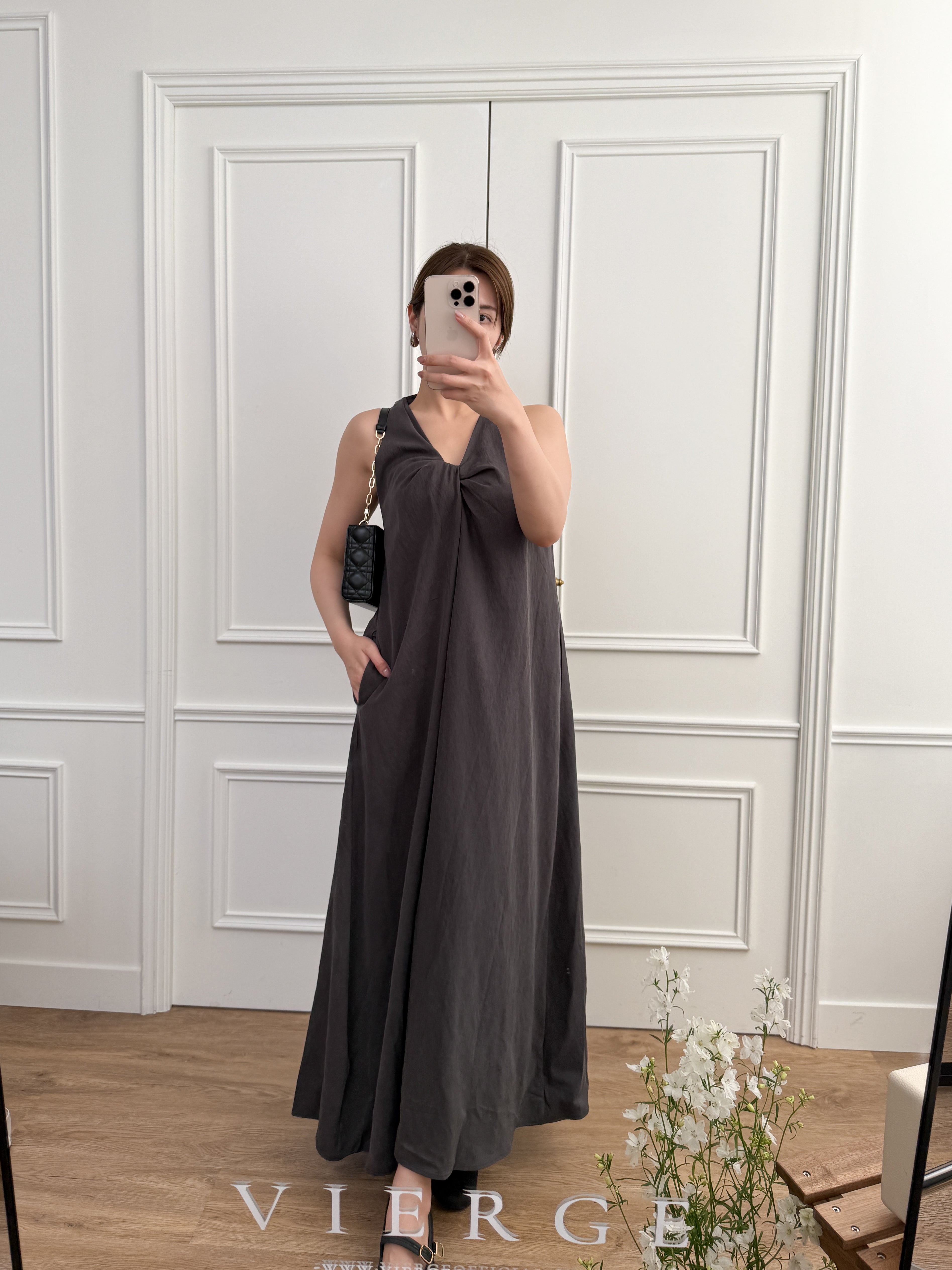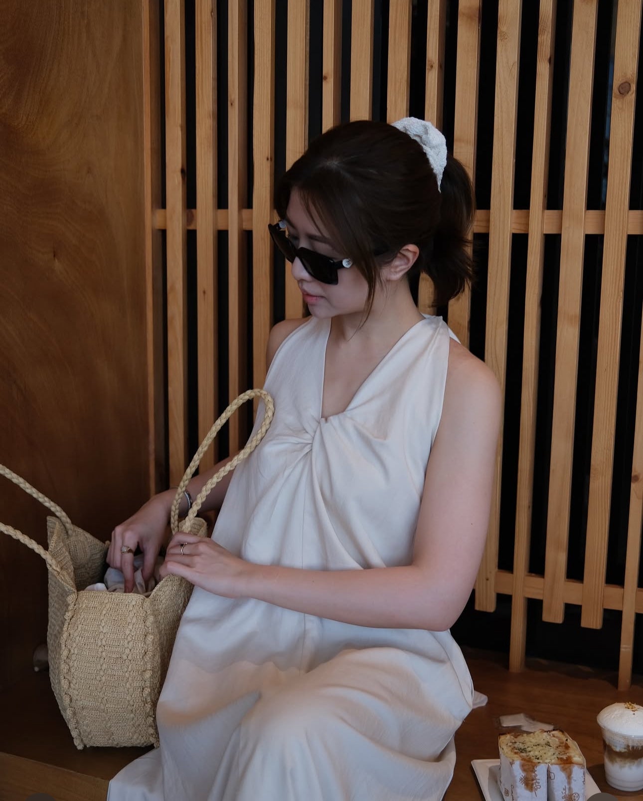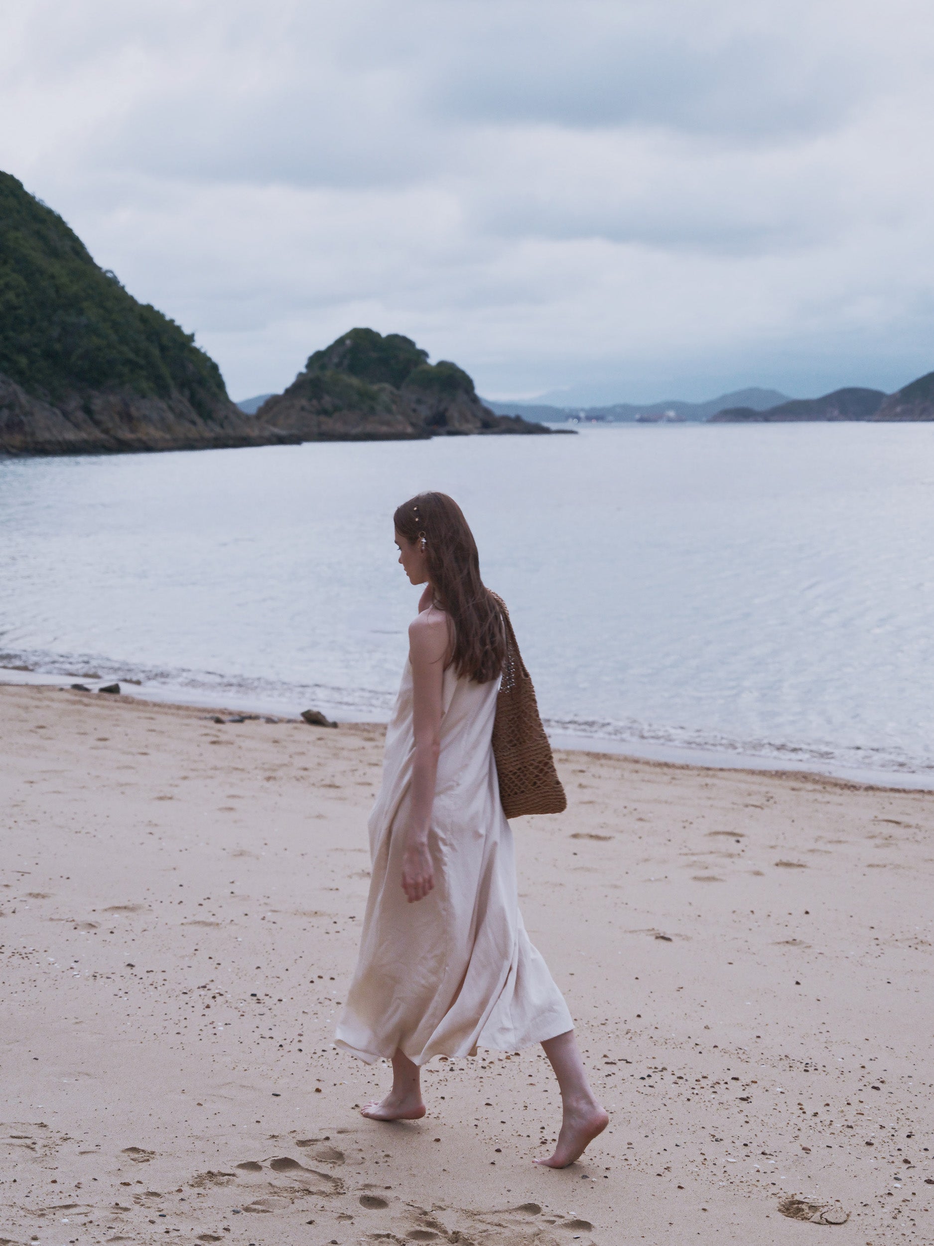 This elegant dress features a flattering halter neckline with a draped design that creates a beautiful silhouette. Its soft, neutral fabric flows gracefully, making it perfect for beach outings or summer events.