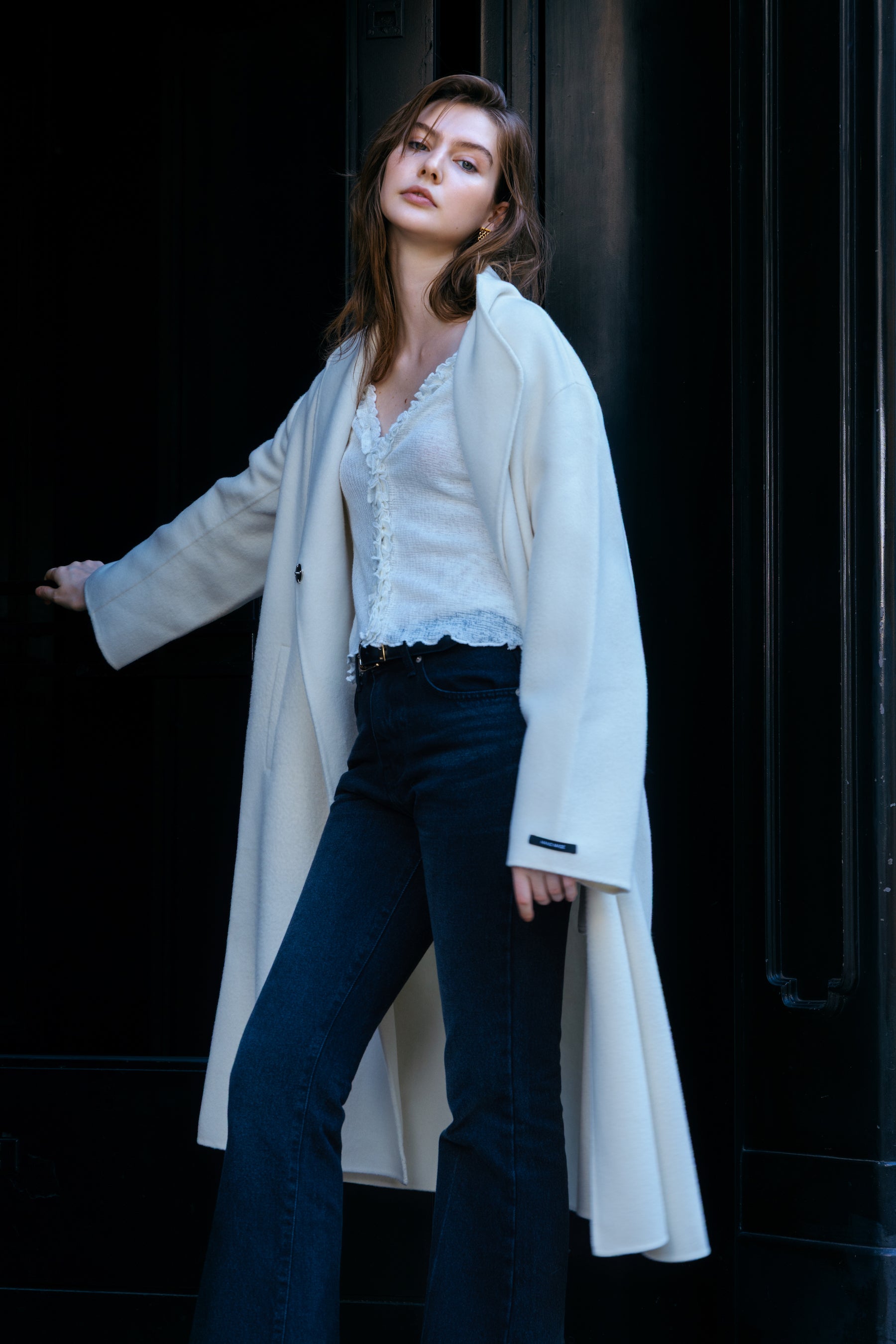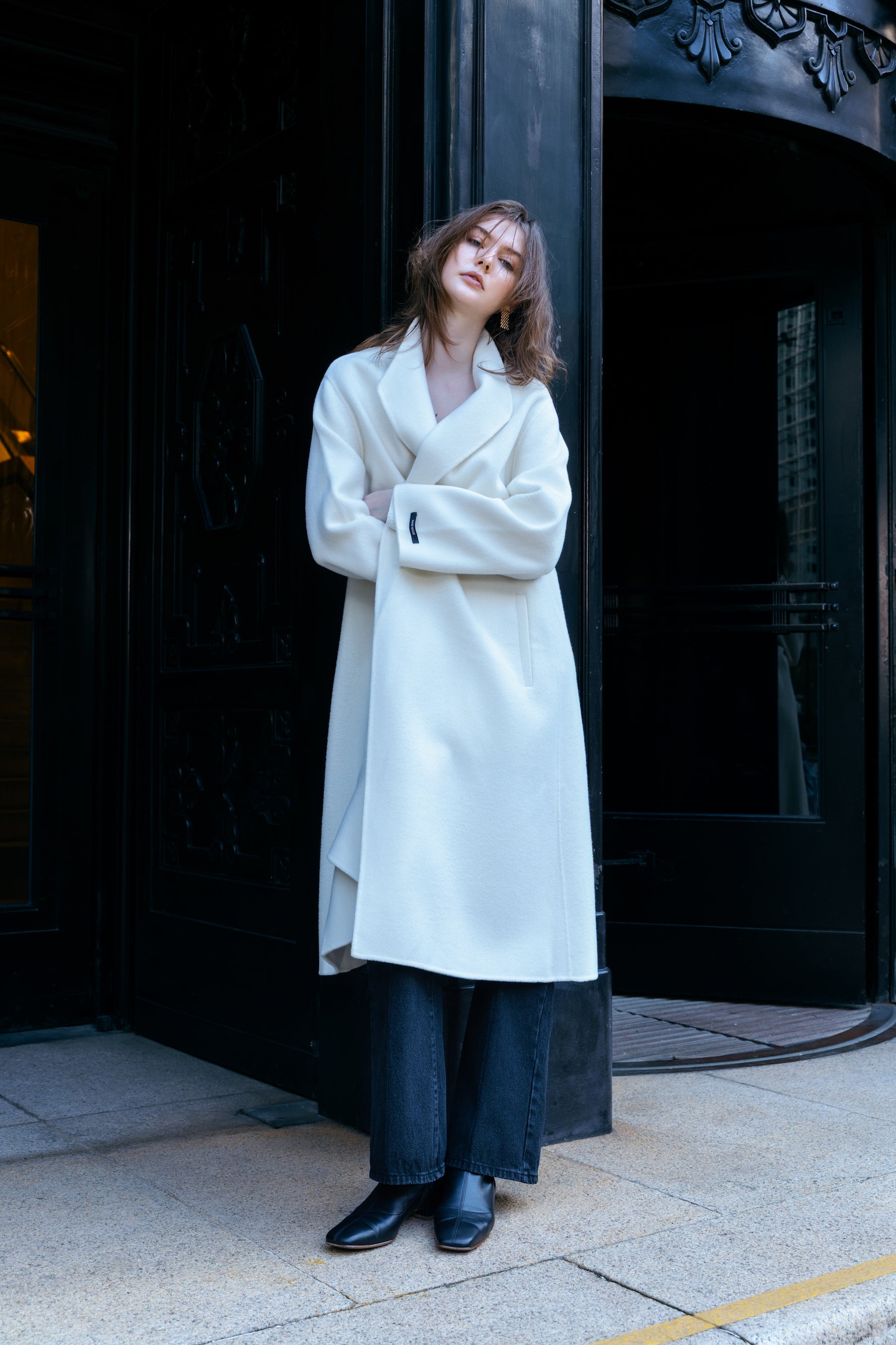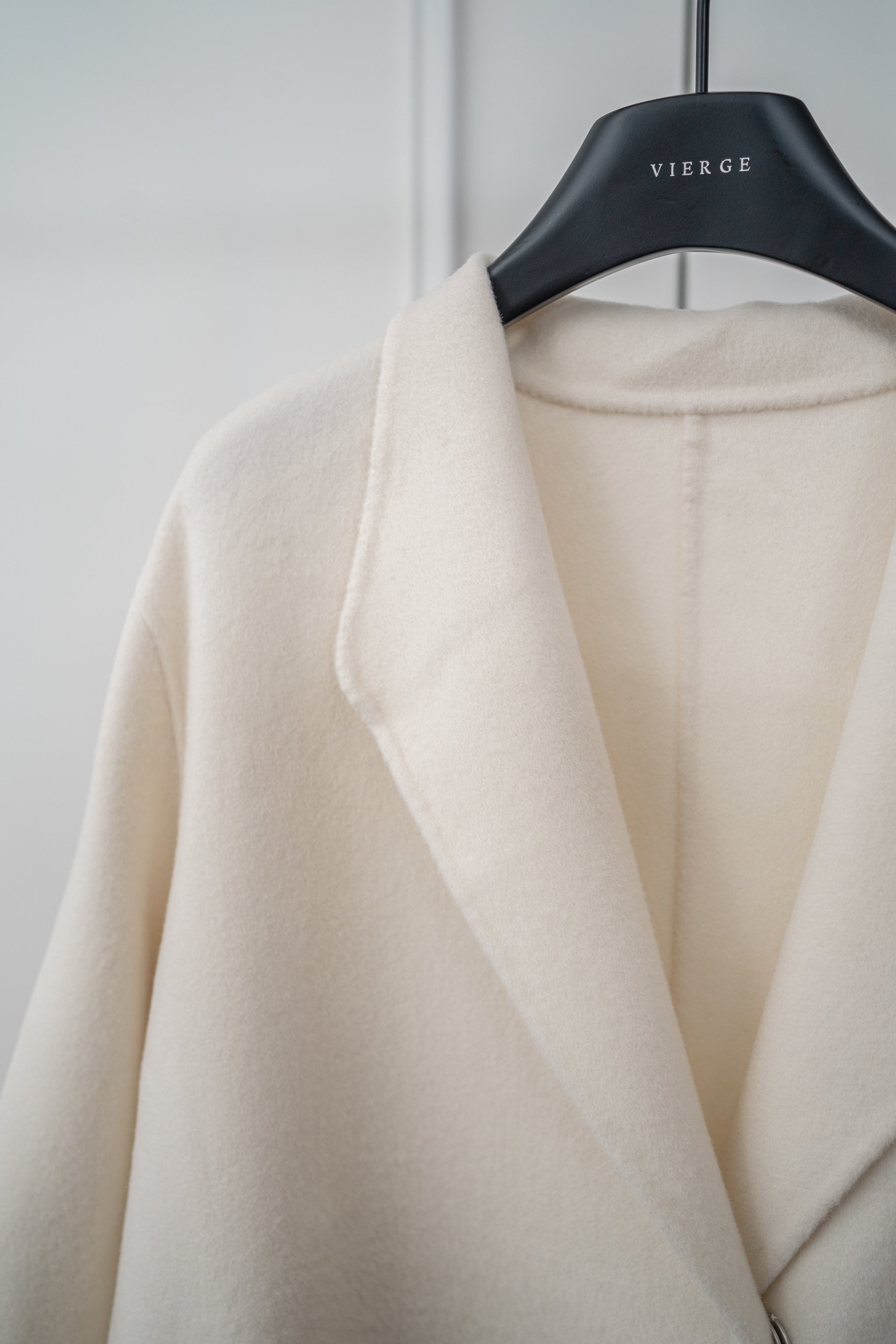 A Signature Collection piece that sold out AW24– the new Amiel Coat is crafted from wool and cashmere in a pristine ivory hue, exuding understated luxury. The design features a clean, tailored silhouette with a wide lapel collar and subtle button closures. Can be worn unbuttoned for a cape-like effect, or with a belt to cinch in the waist for a more elegant and formal look.