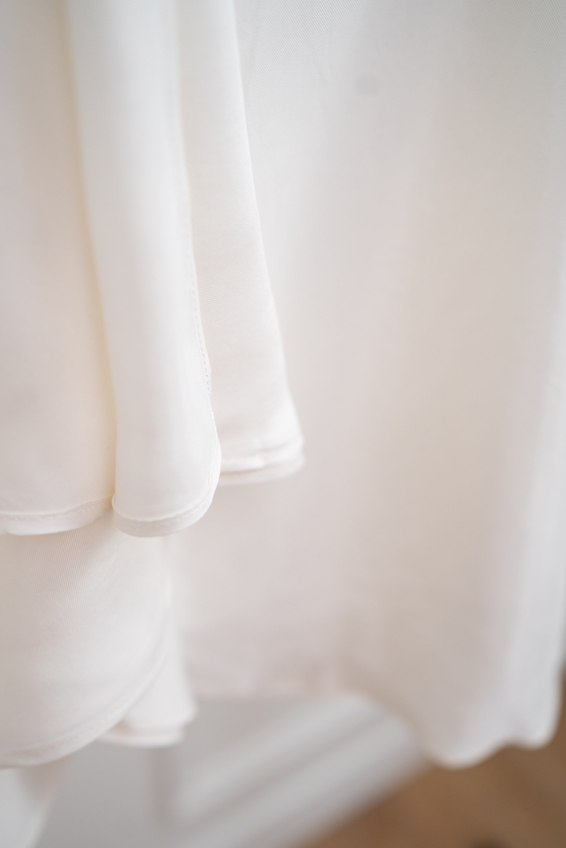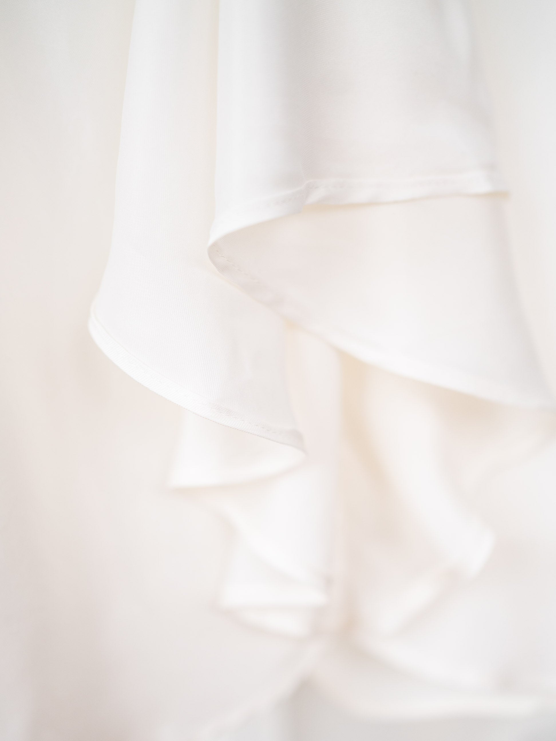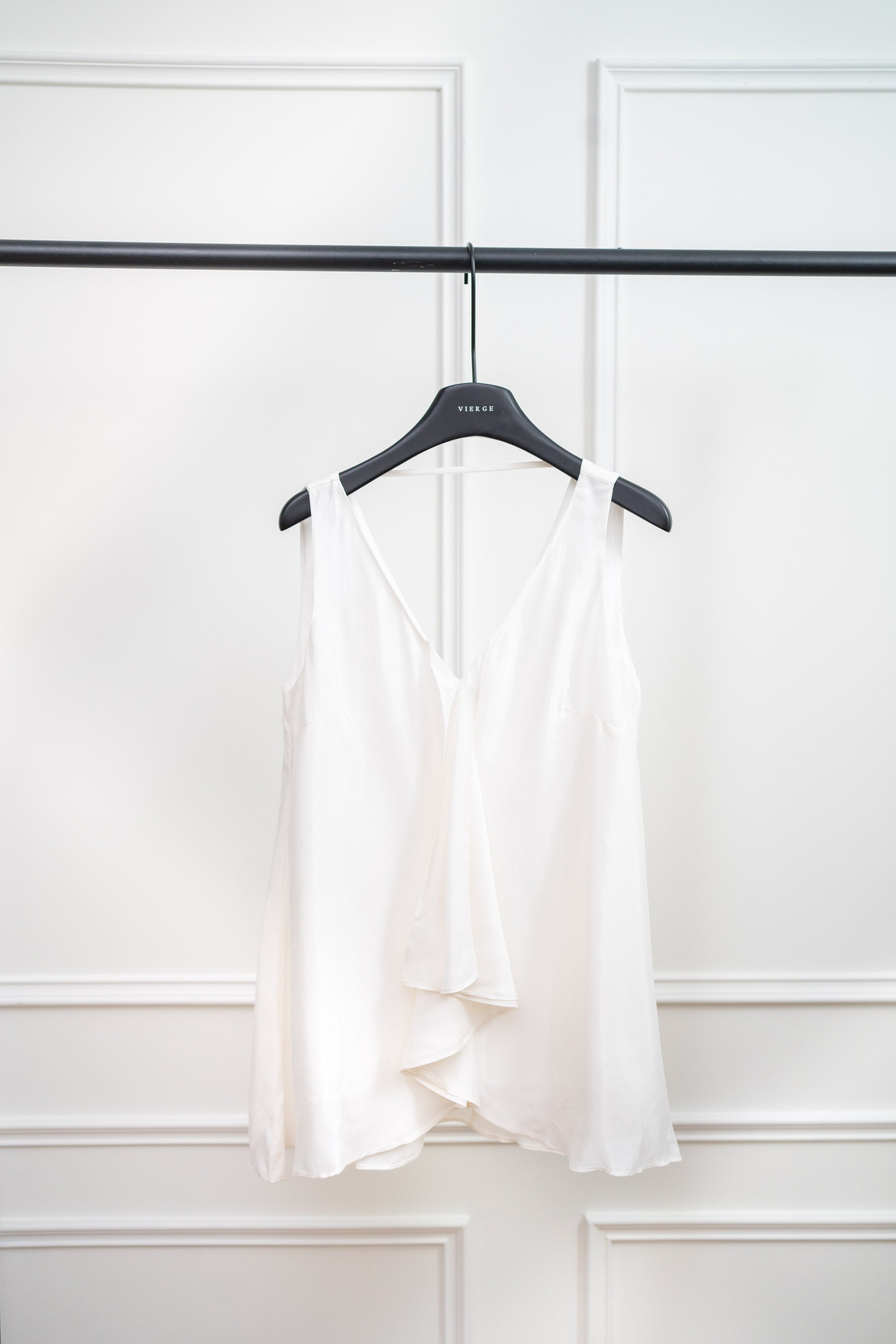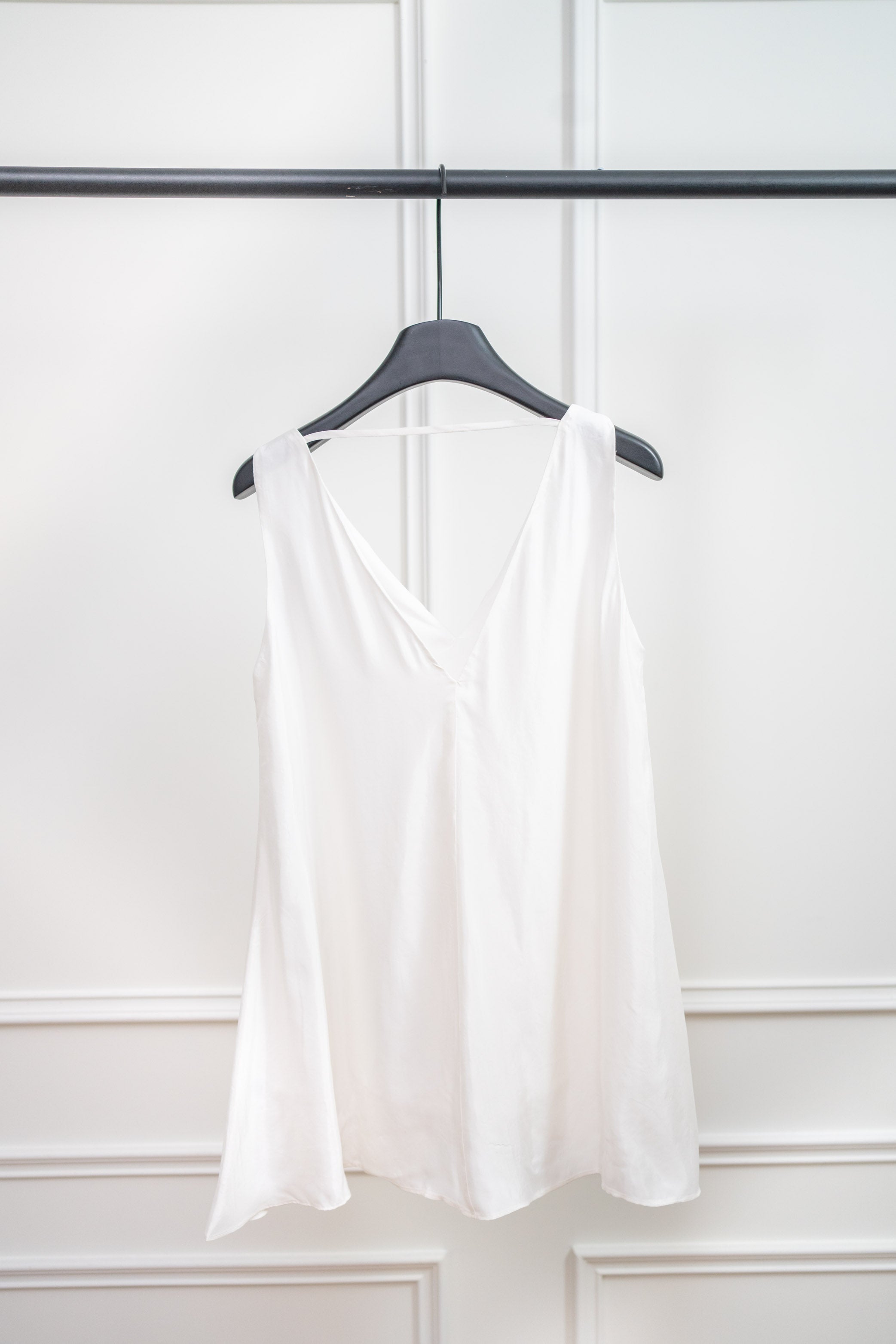 This top showcases a light, airy fabric with a graceful draped design and a flattering V-neckline. Its sleeveless cut and soft white color make it a versatile piece, perfect for layering or wearing alone for a chic, relaxed look.