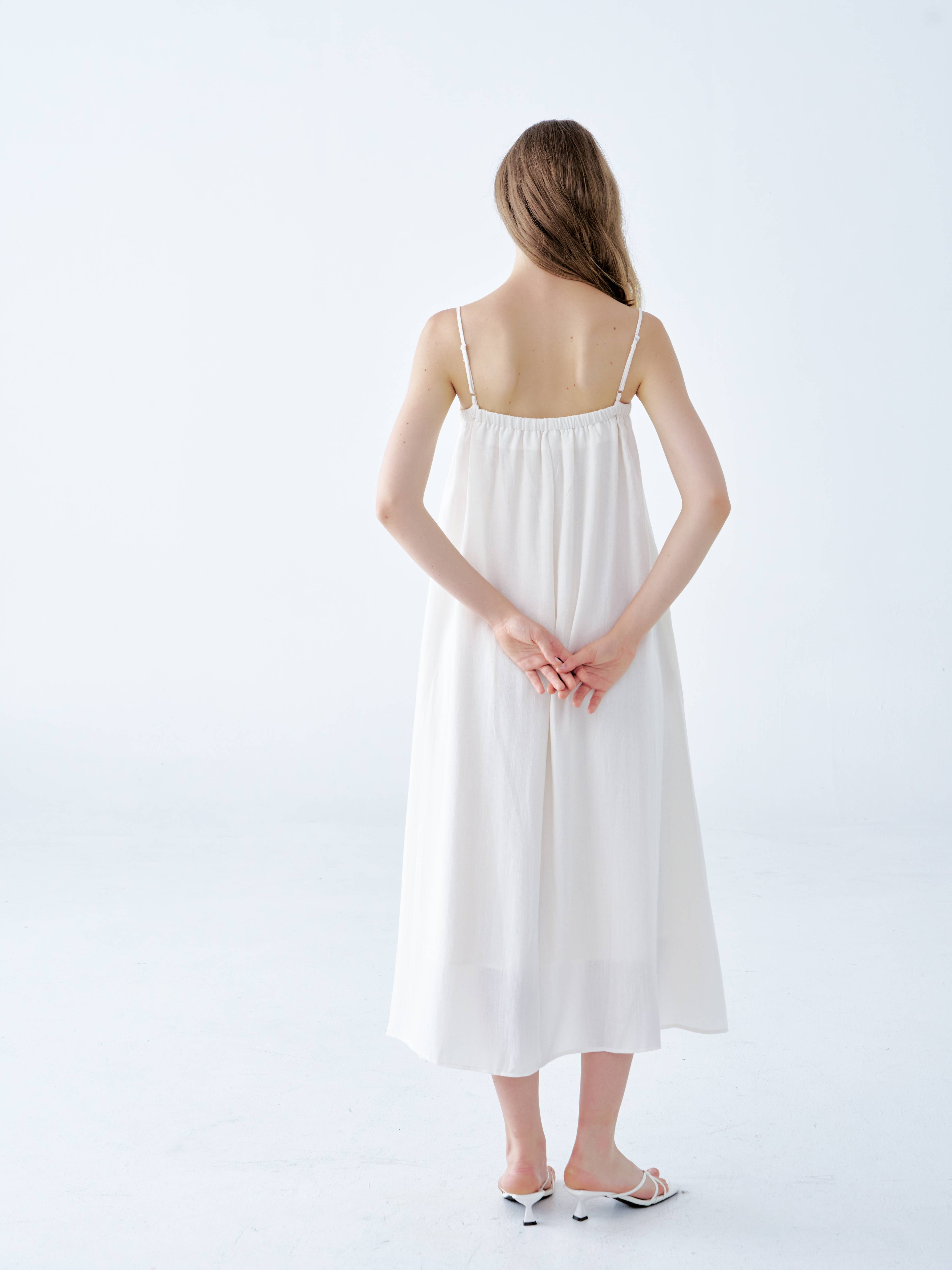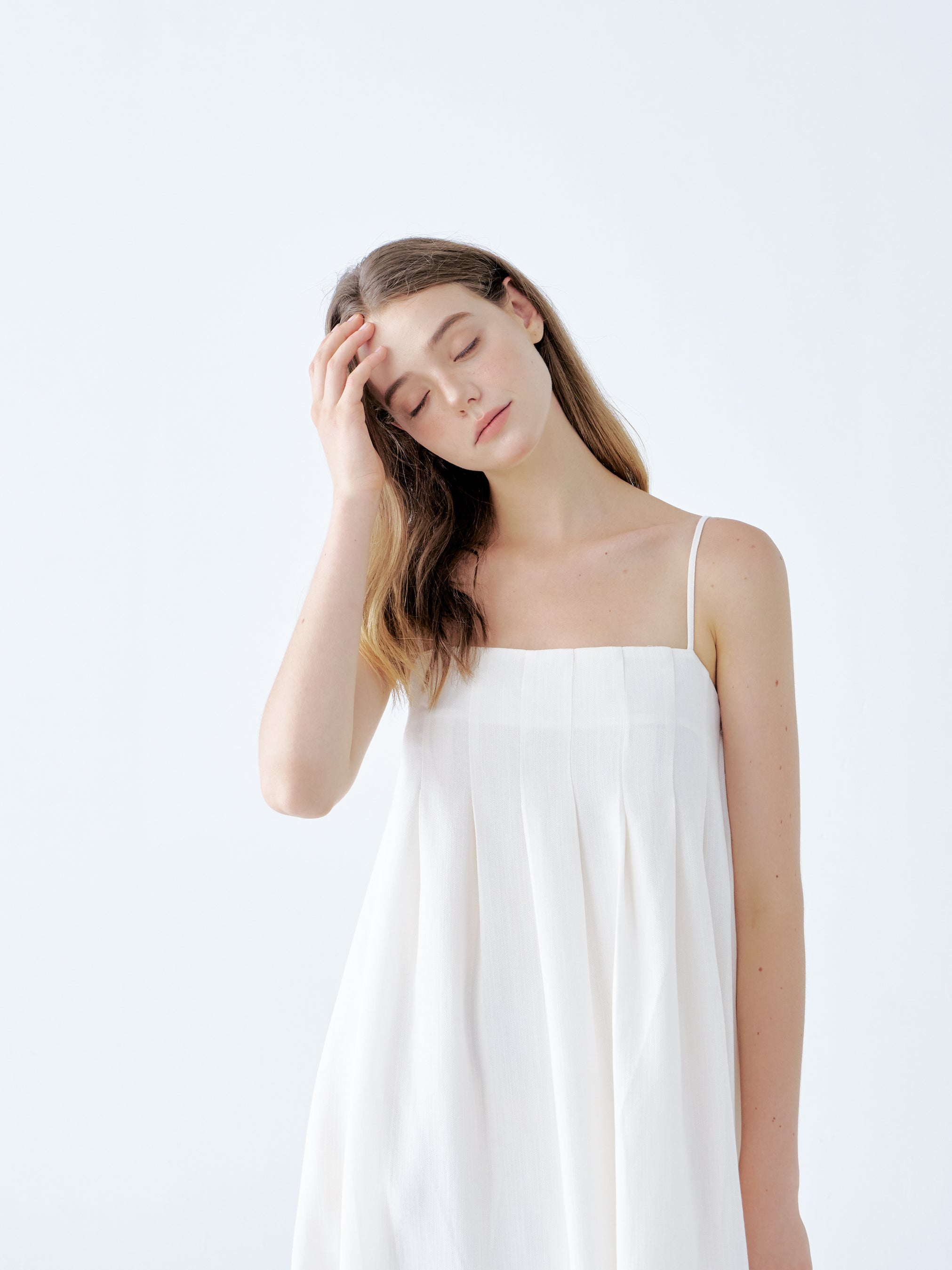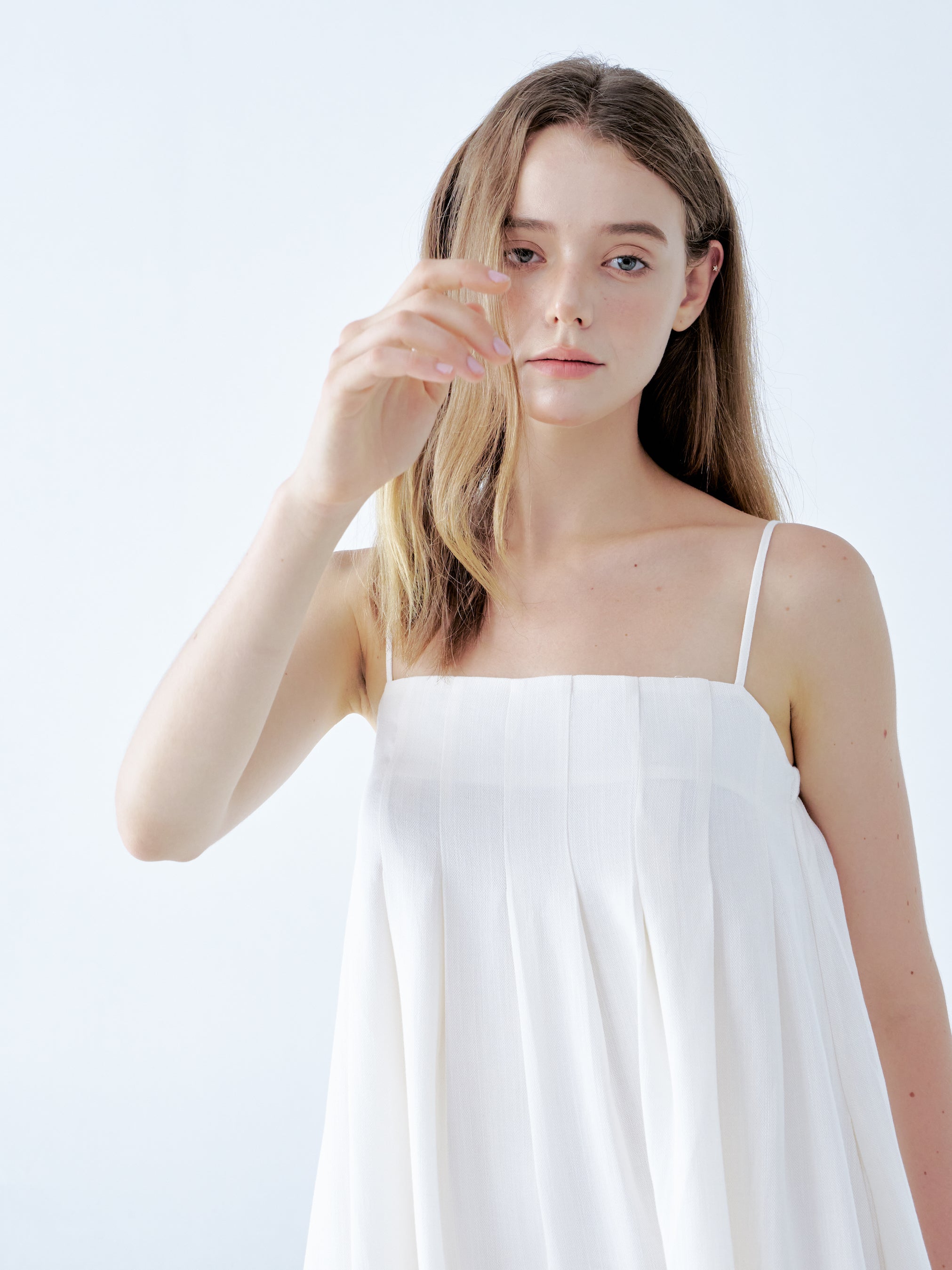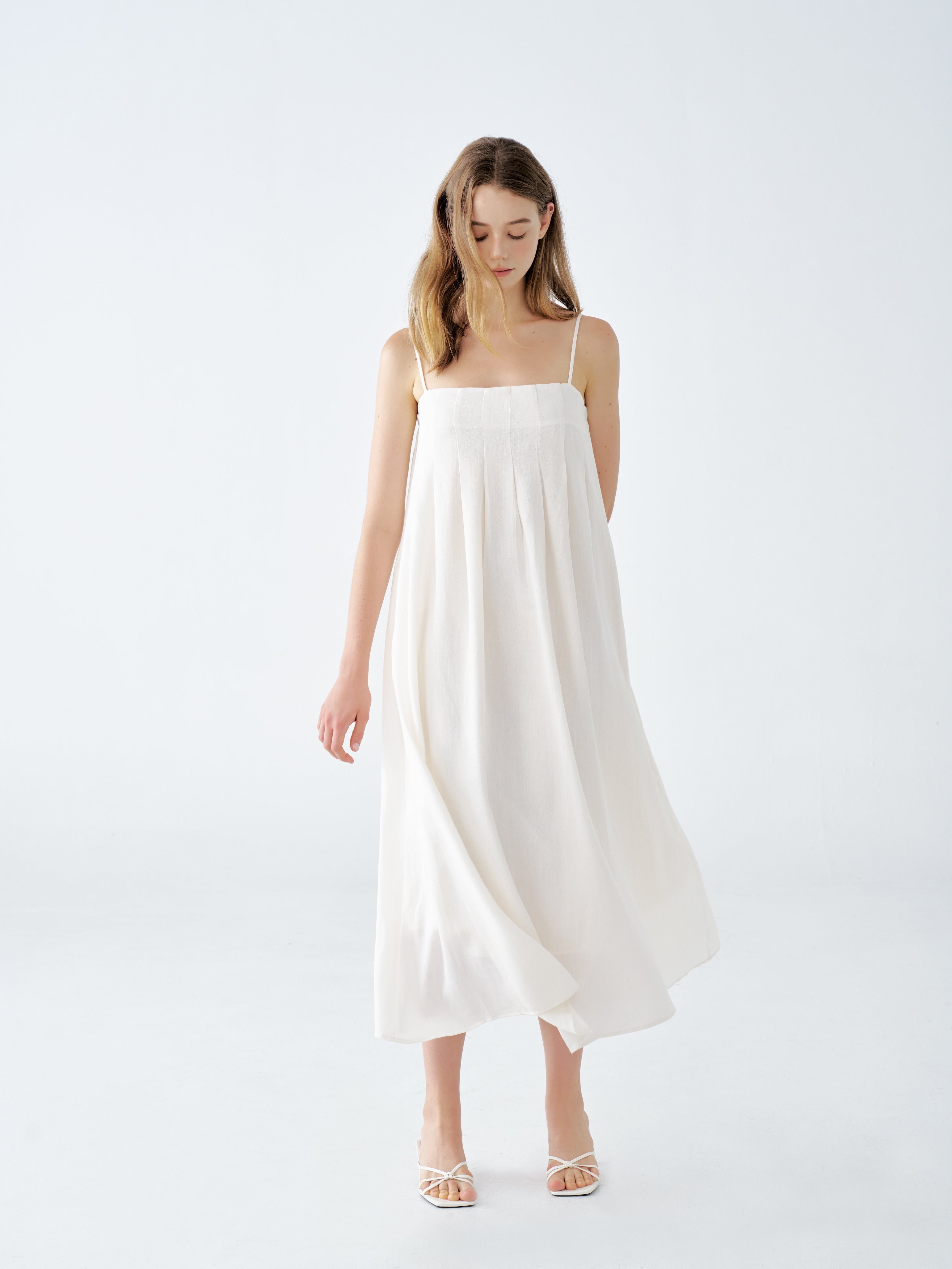 This dress features a simple yet elegant design with spaghetti straps and a lightly pleated bodice that flows into a graceful A-line silhouette. The soft white fabric exudes a fresh and airy vibe, making it perfect for warm-weather occasions.