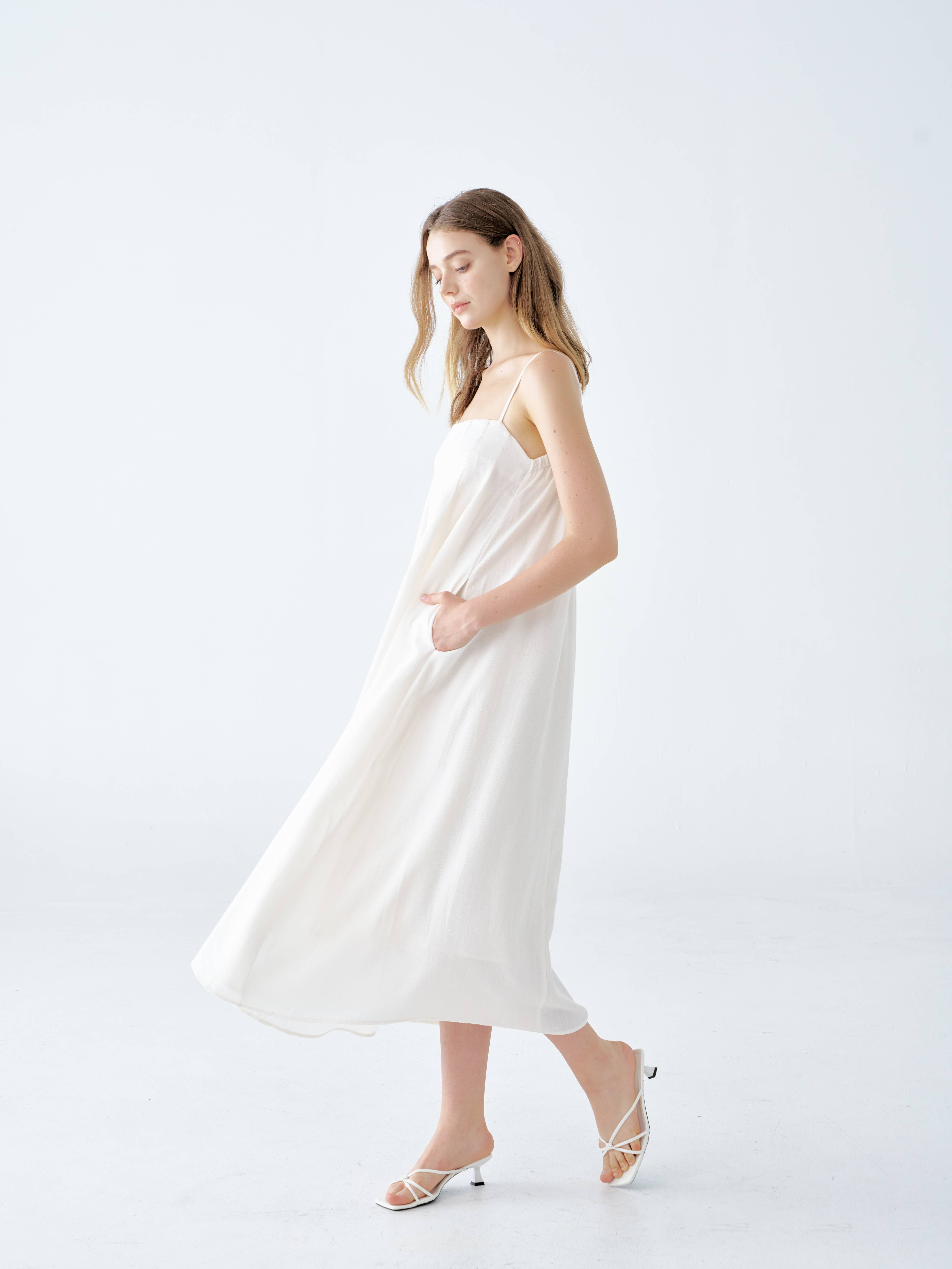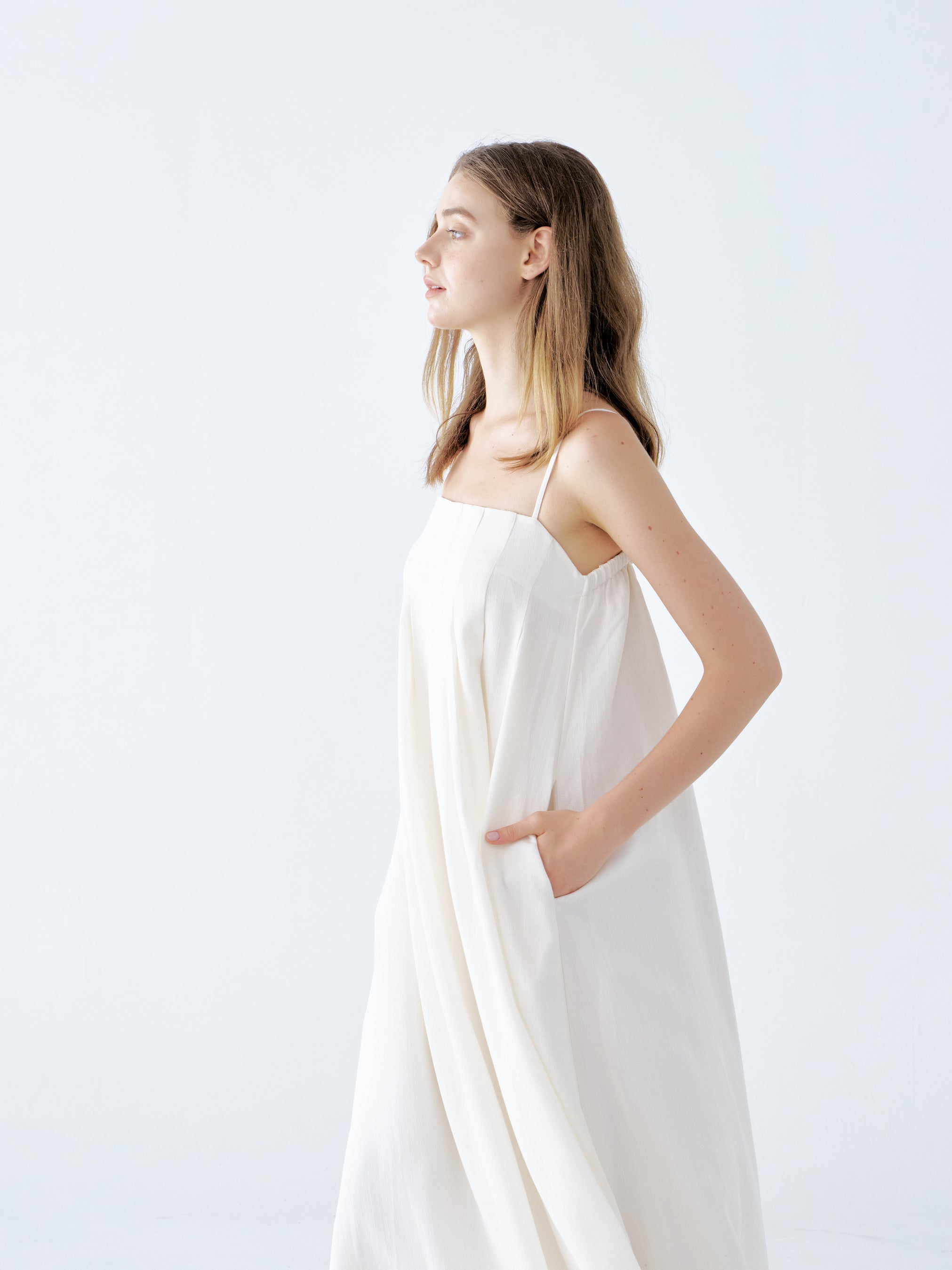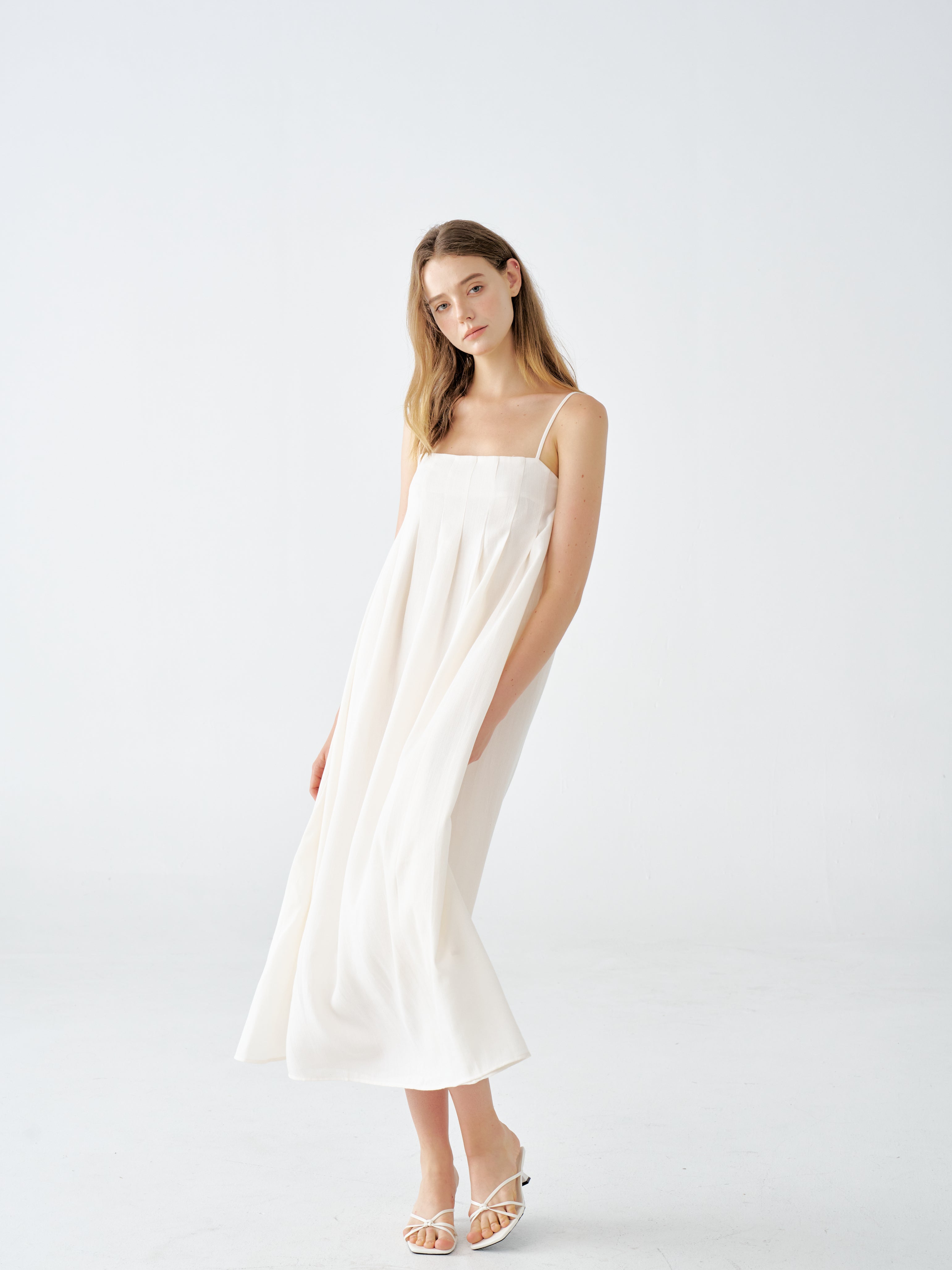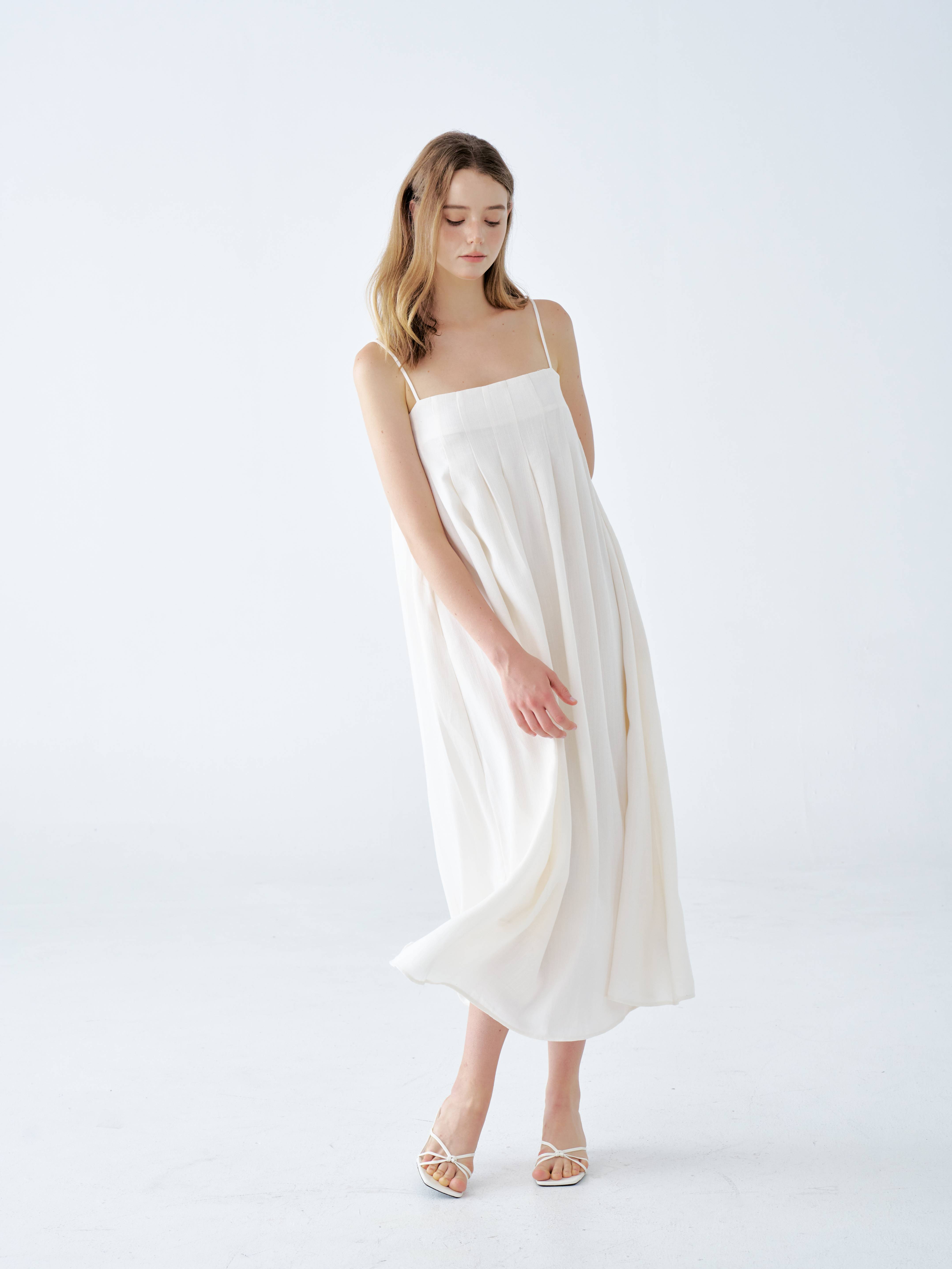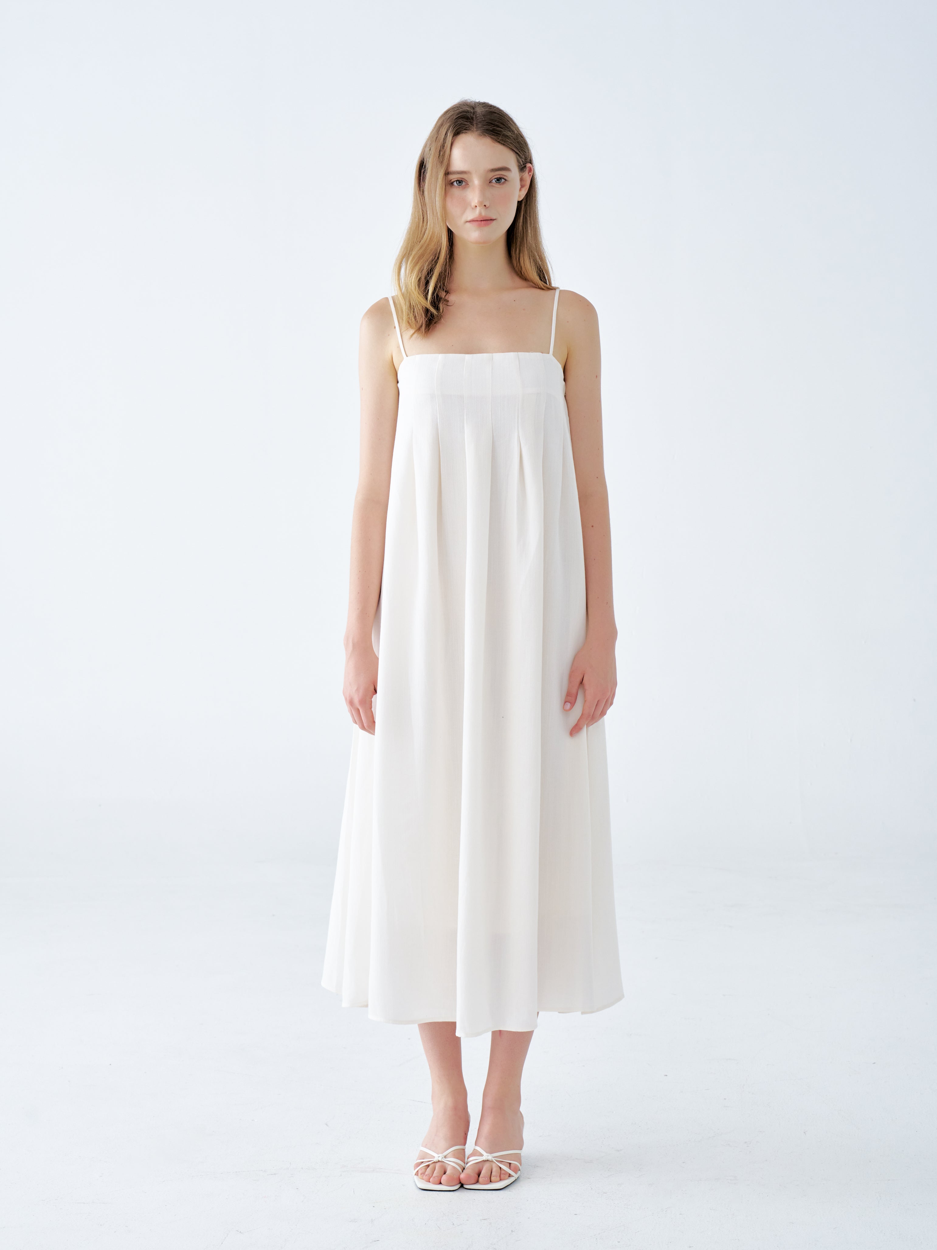 This dress features a simple yet elegant design with spaghetti straps and a lightly pleated bodice that flows into a graceful A-line silhouette. The soft white fabric exudes a fresh and airy vibe, making it perfect for warm-weather occasions.