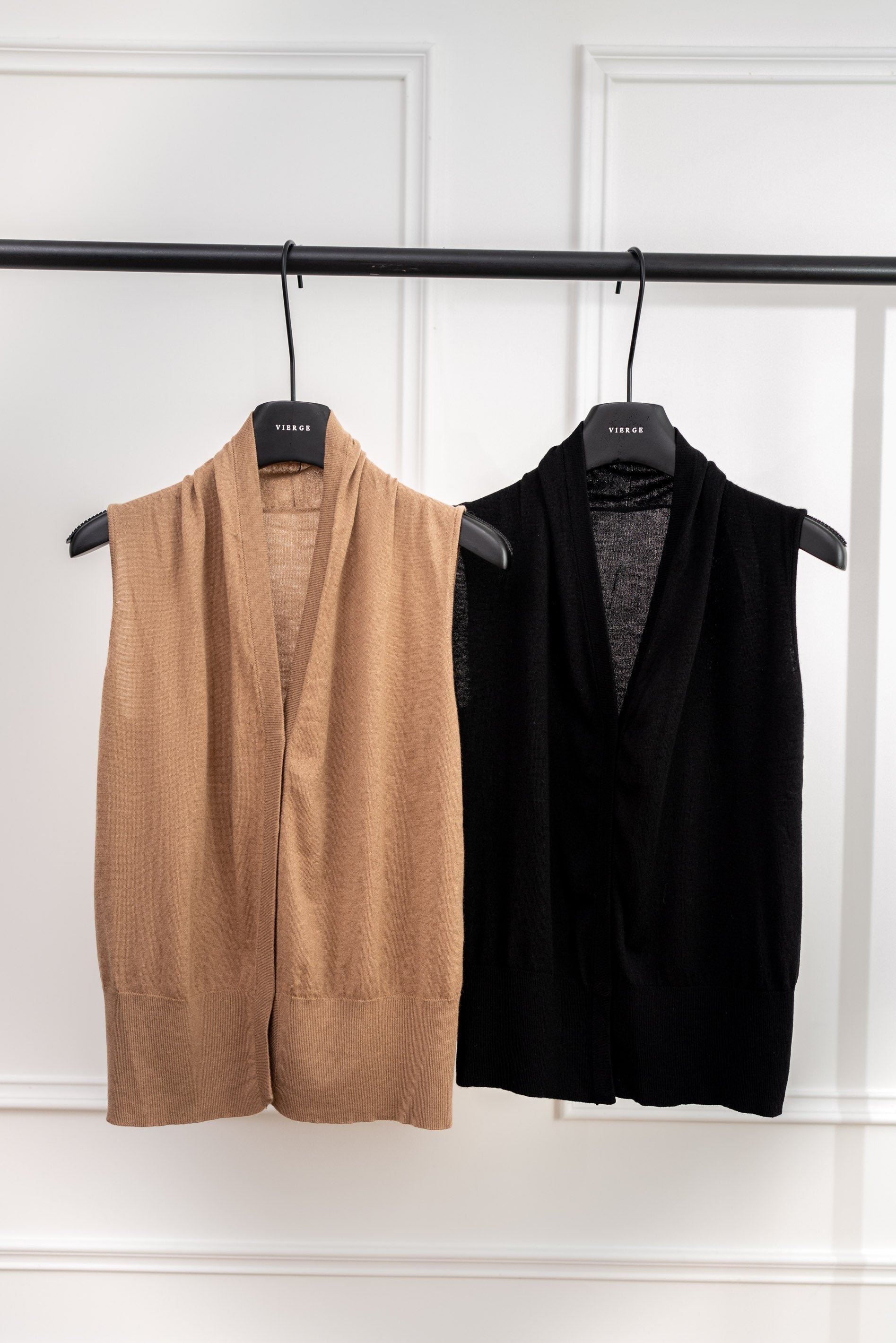 The vests feature a minimalist design with a relaxed fit, perfect for layering over various outfits. Crafted from soft, textured fabric, they offer a cozy yet chic look that seamlessly transitions from casual to more polished styles.