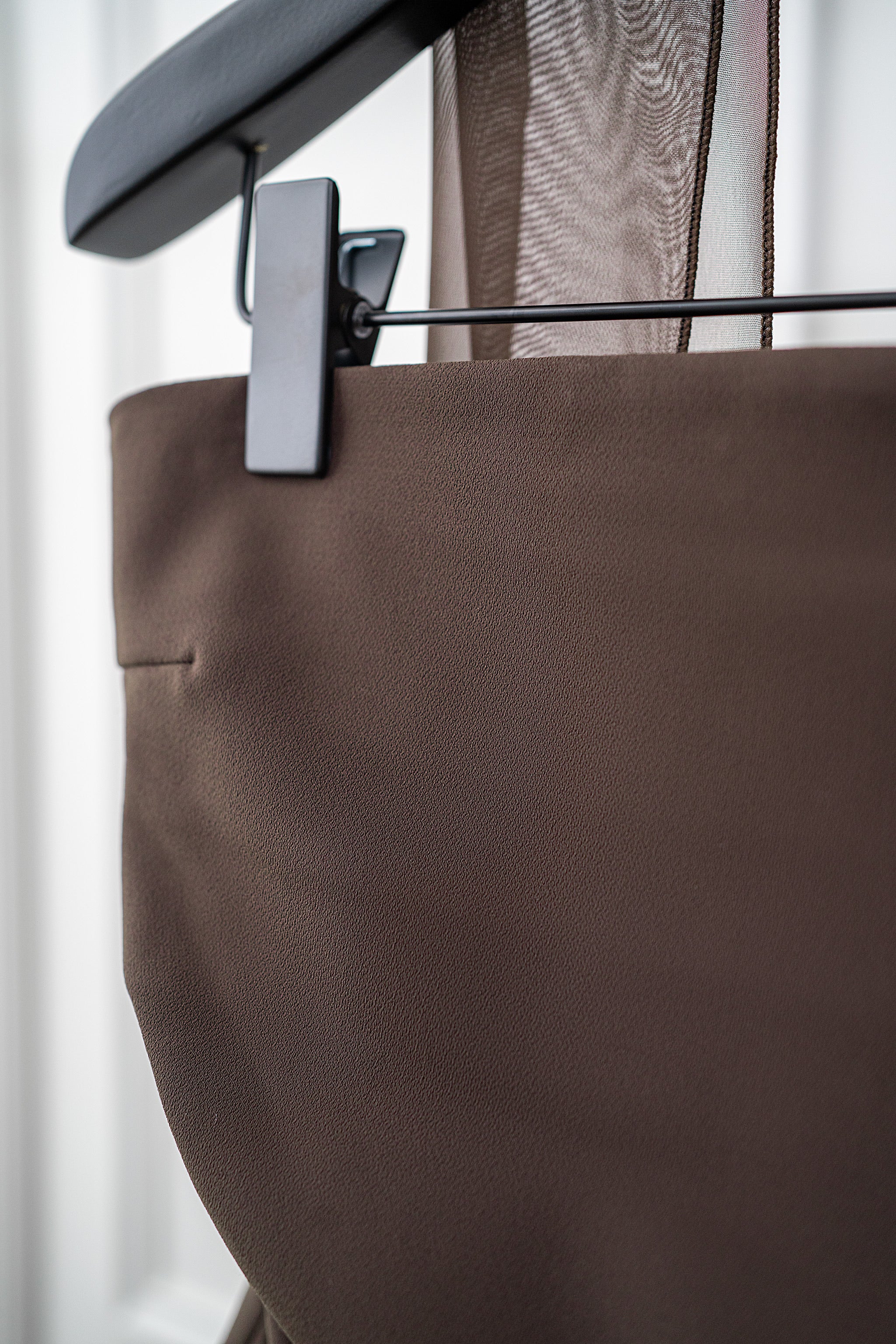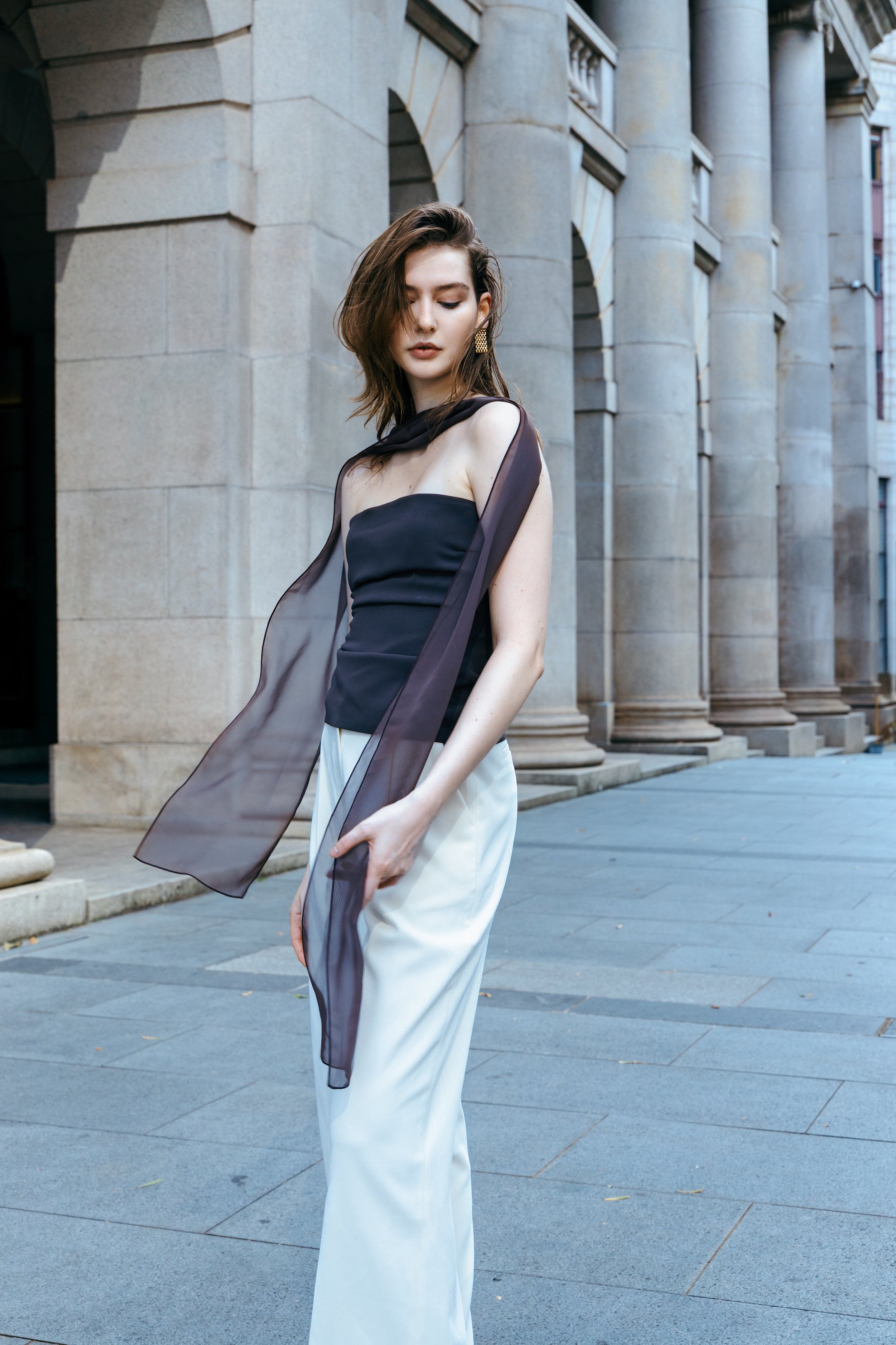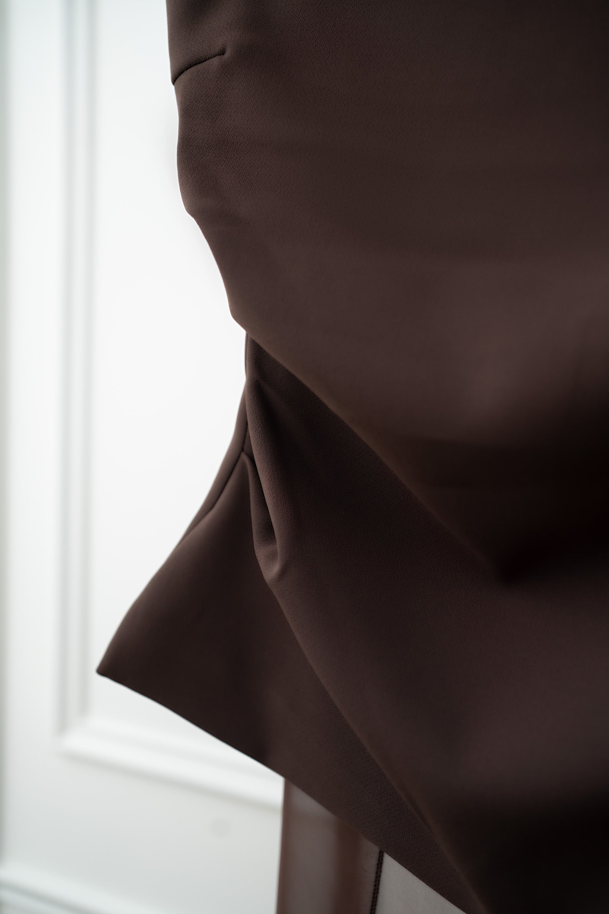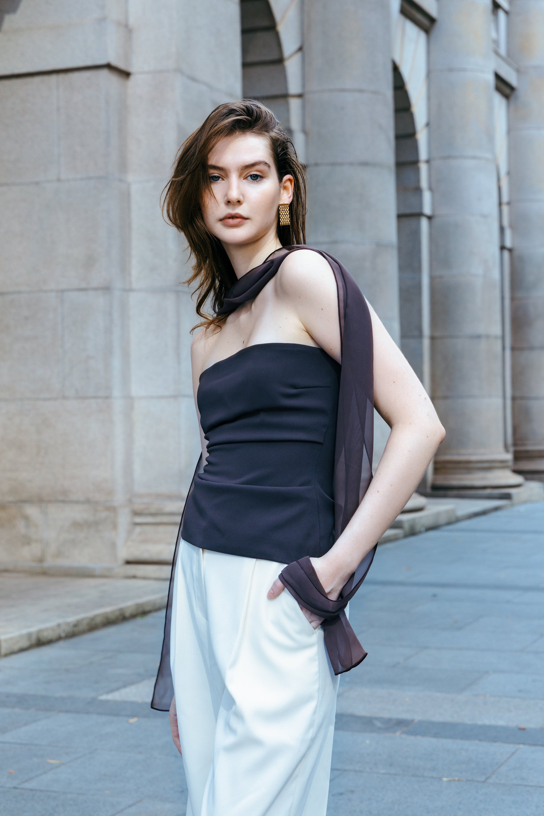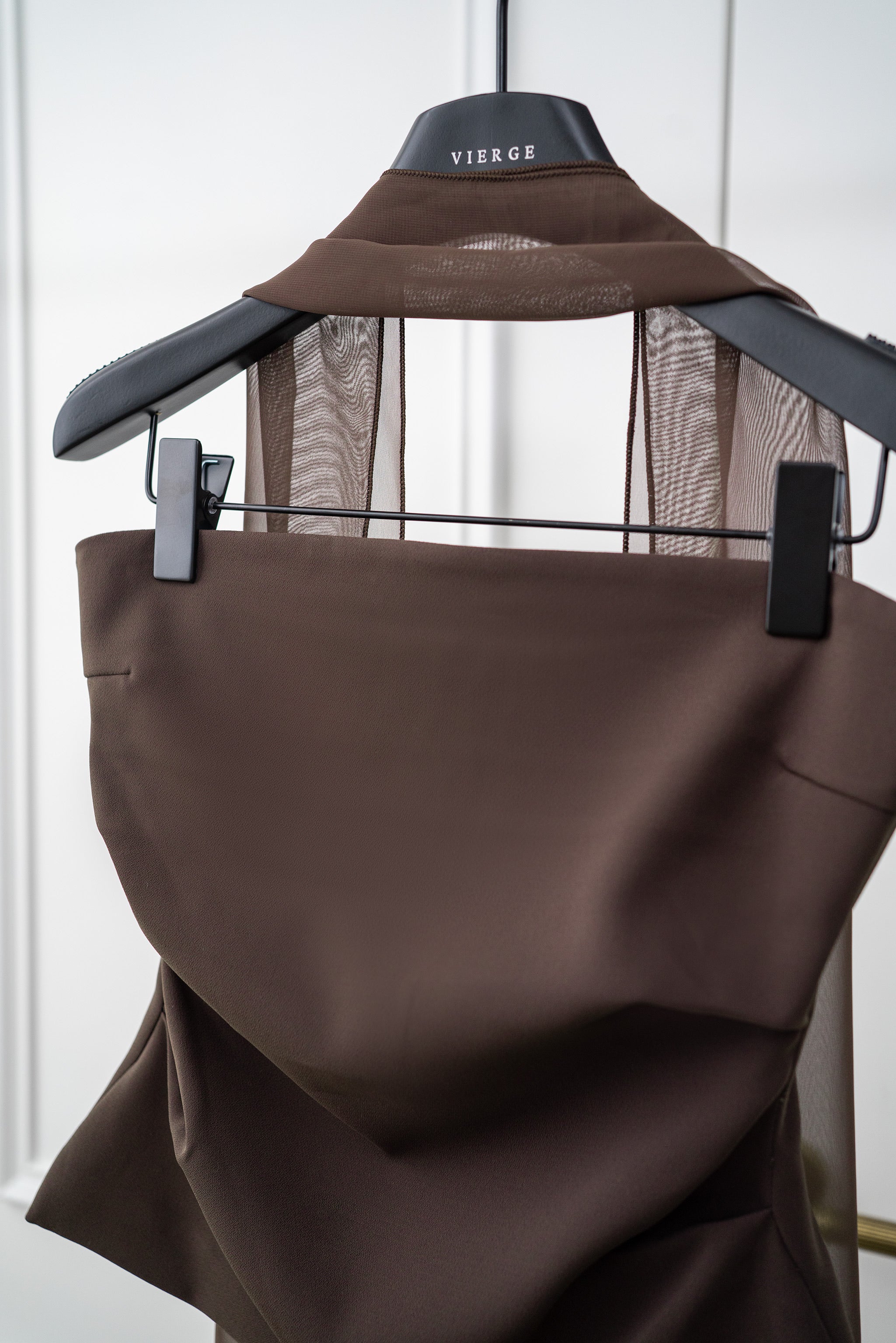 A VIERGE SIGNATURE COLLECTION item, the new espresso brown top is accented with a sheer scarf that wraps gracefully around the neck, and cascades down one side in a fluid, asymmetric drape, exuding elegance in each movement. The new design adds to the versatility of the piece.