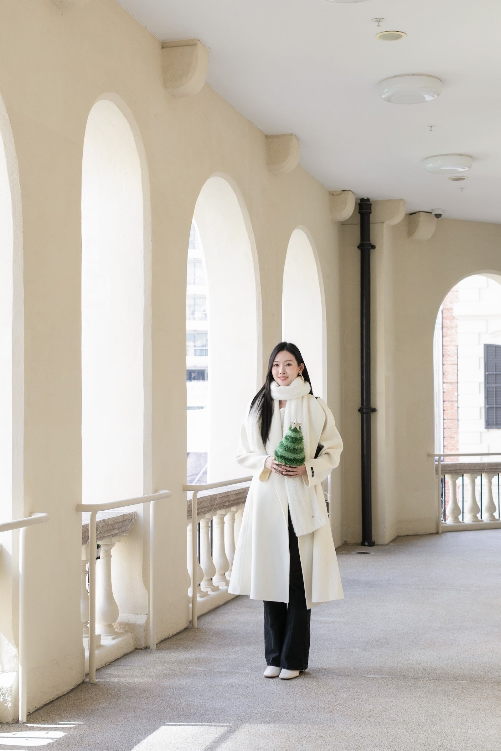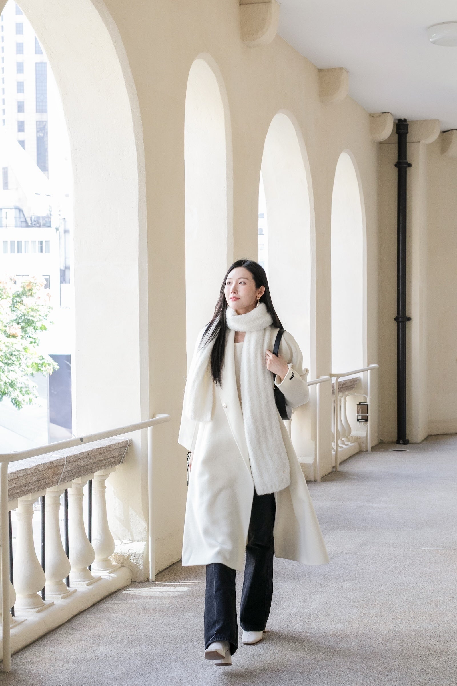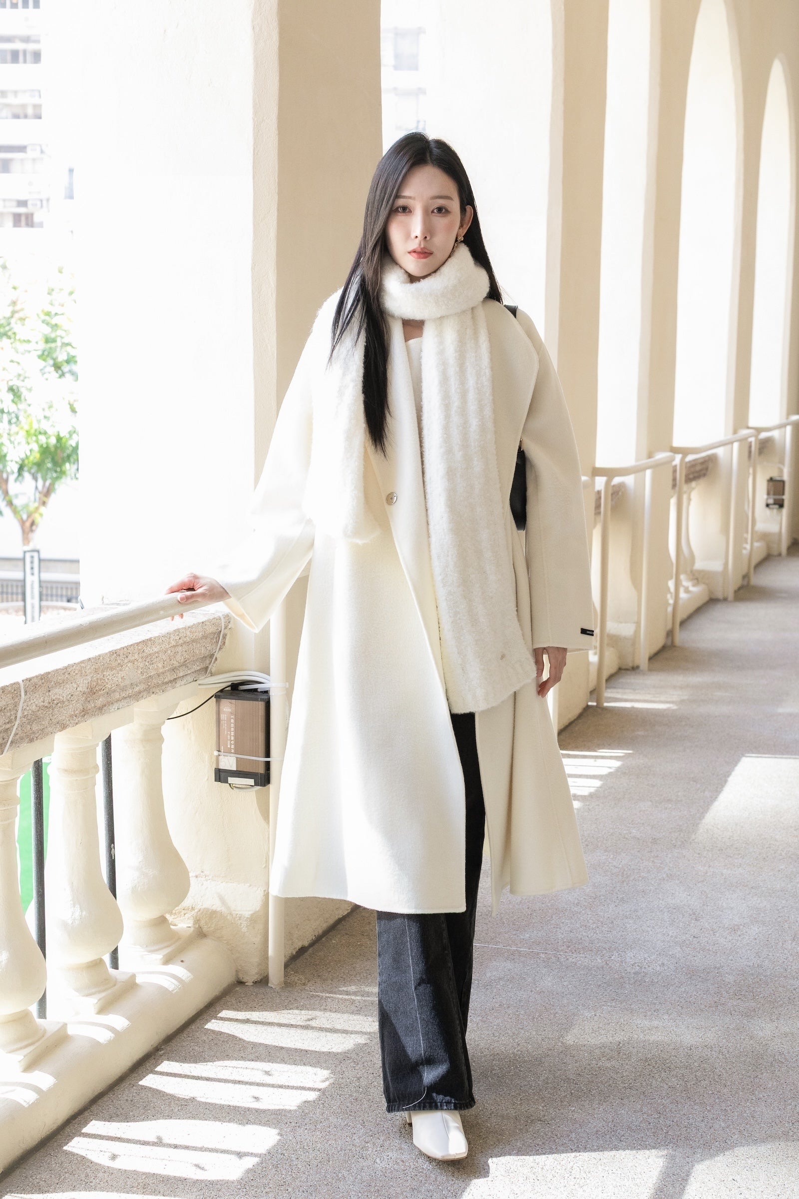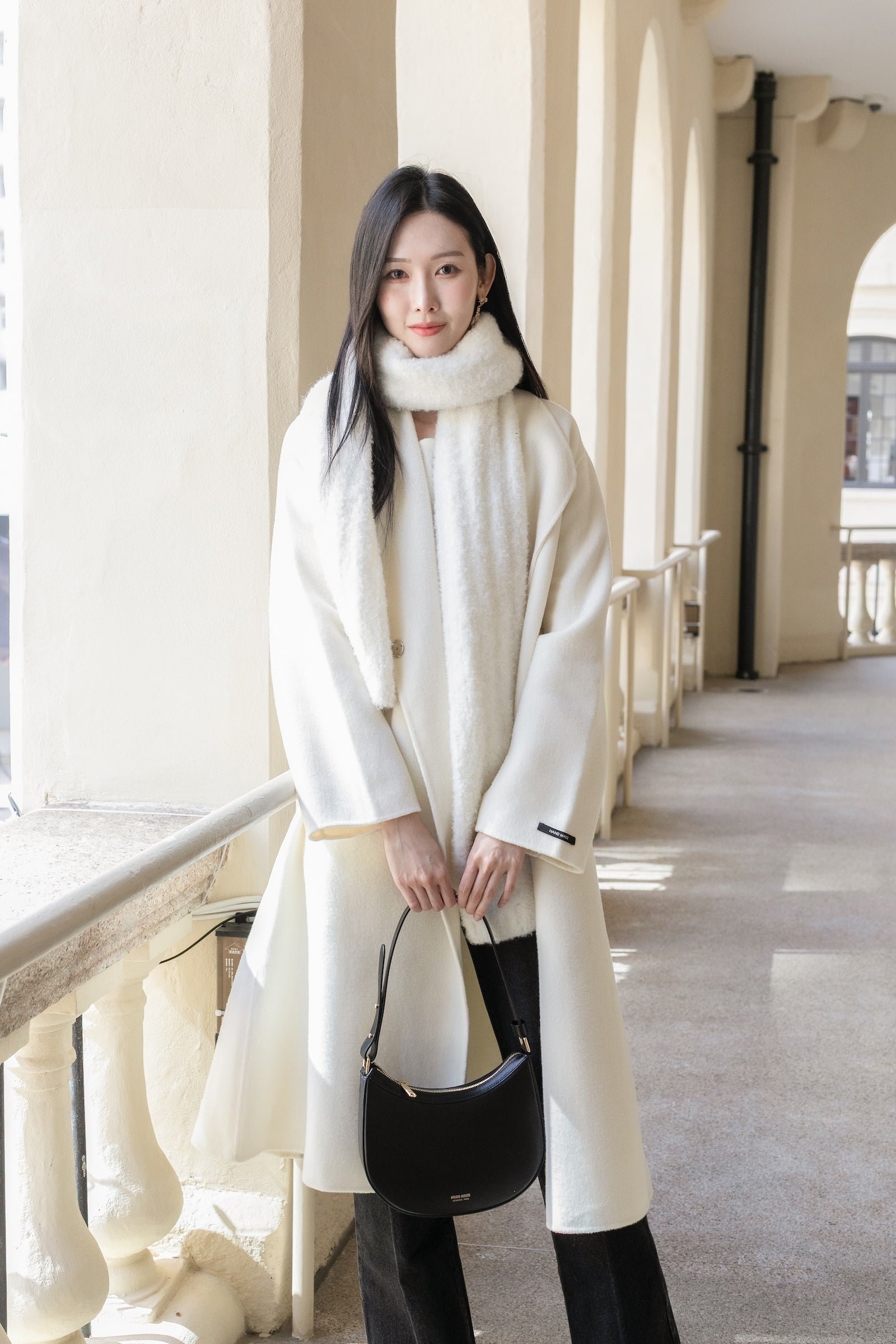A Signature Collection piece that sold out AW24– the new Amiel Coat is crafted from wool and cashmere in a pristine ivory hue, exuding understated luxury. The design features a clean, tailored silhouette with a wide lapel collar and subtle button closures. Can be worn unbuttoned for a cape-like effect, or with a belt to cinch in the waist for a more elegant and formal look.